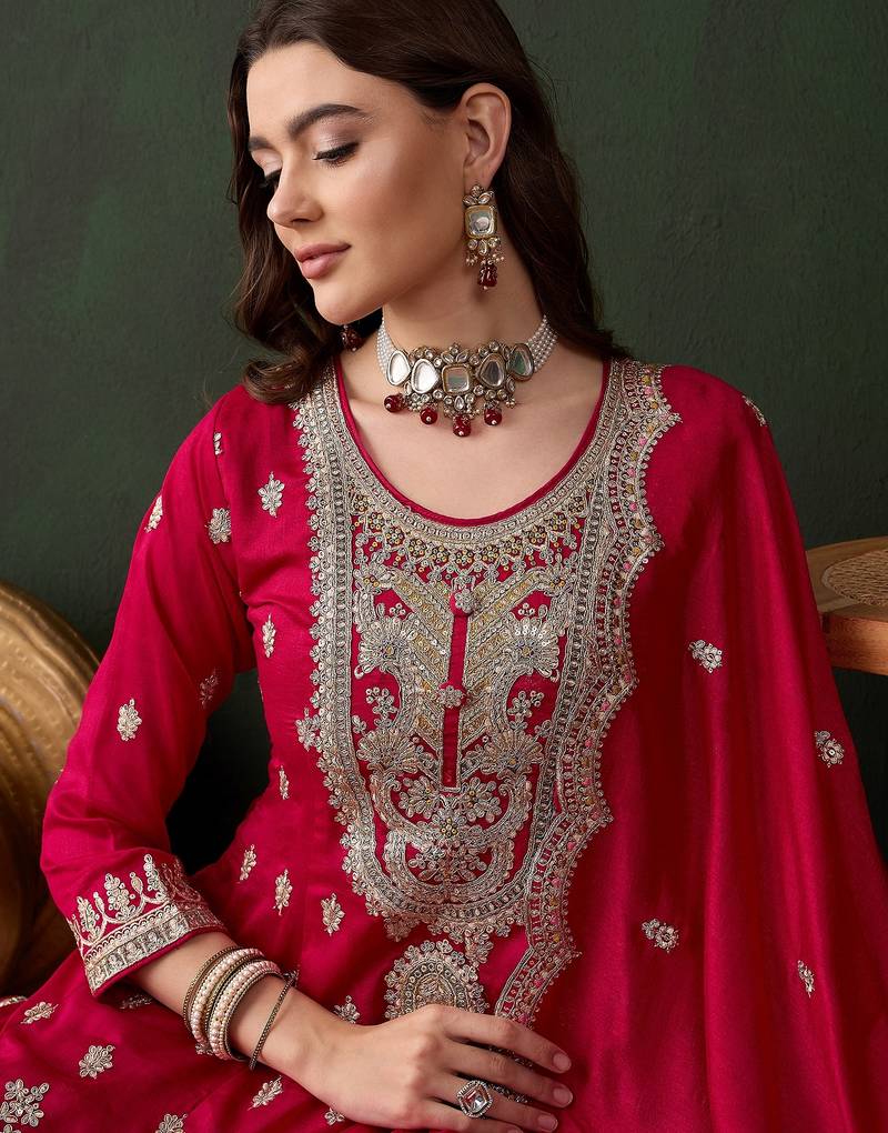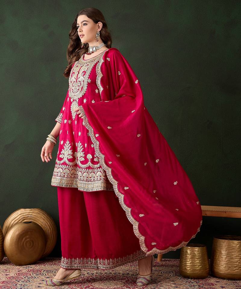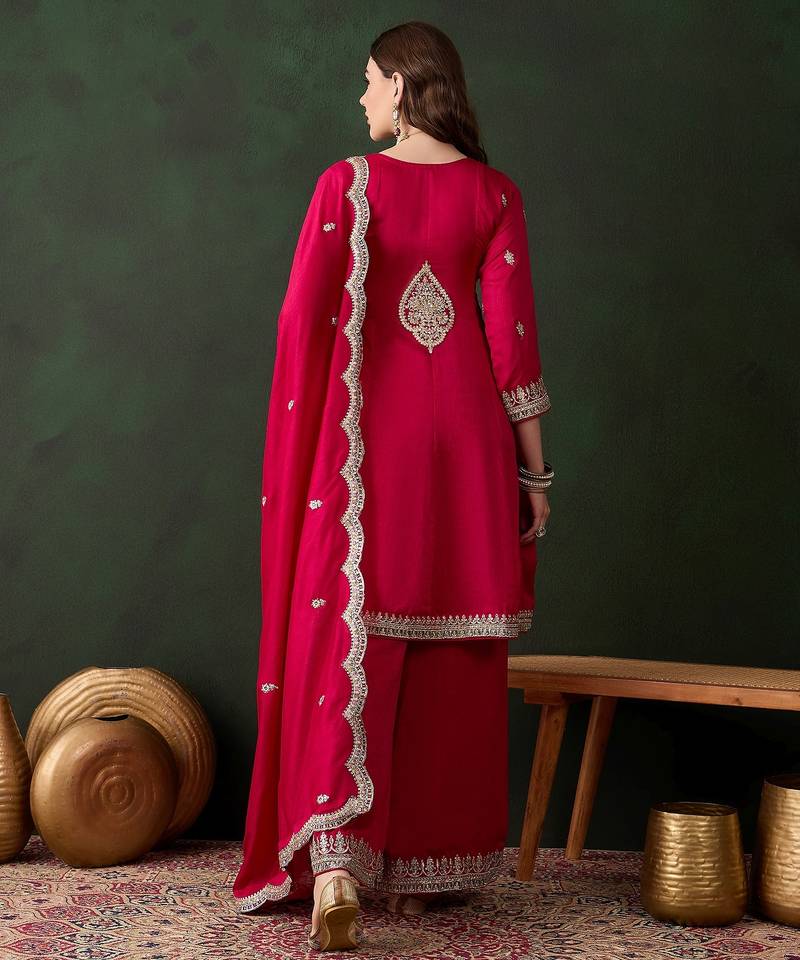 | Product Description | Elegant Pink Straight Kurta Tailored From Premium Vichitra Silk. Beautiful Embroidery Enhances Its Festive And Designer Look. Comfortable Stitched Palazzo With Santoon Inner For All Day Wear. Embroidered Vichitra Silk Dupatta Completes The Stylish Ensemble. Suitable For Weddings, Festive Events, And Cultural Gatherings. |