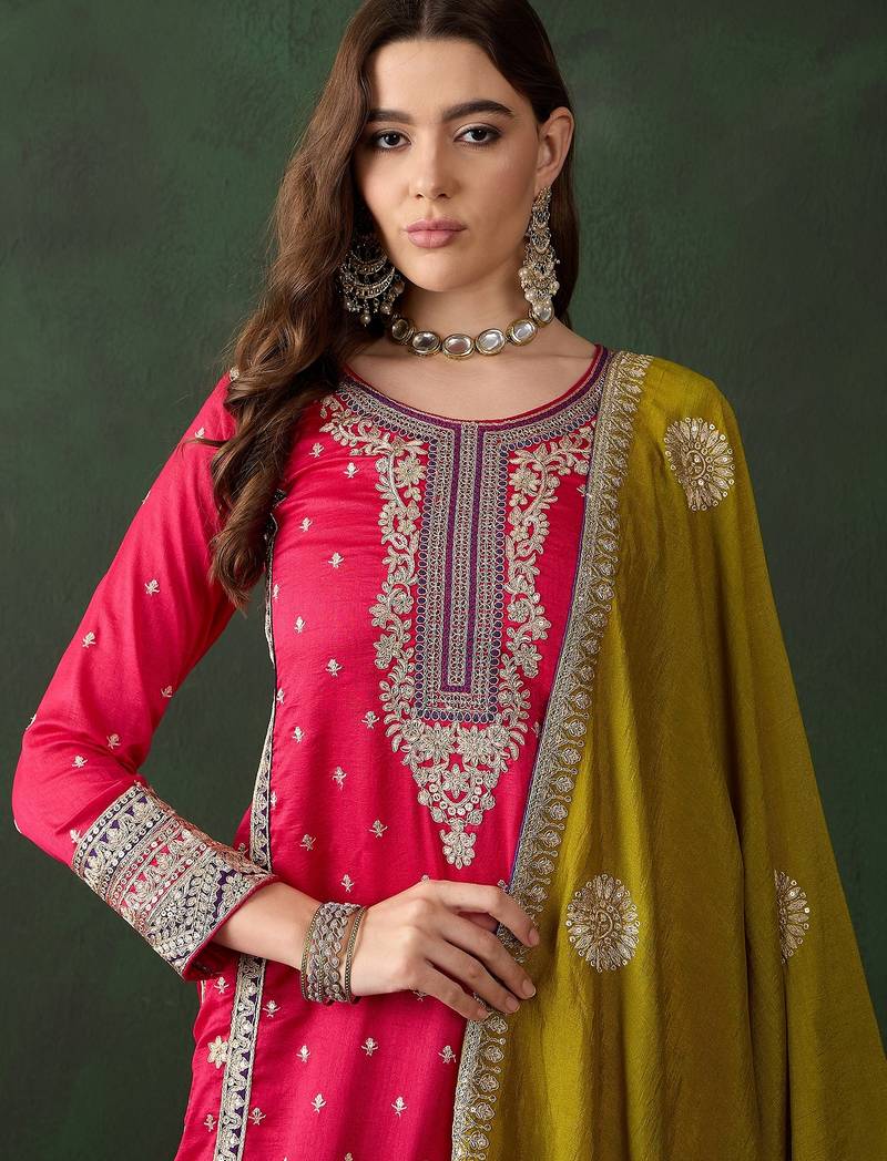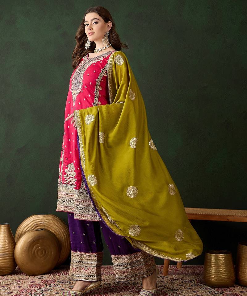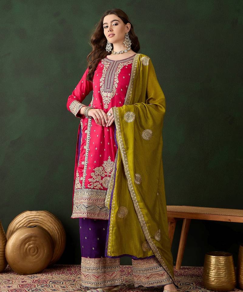 | Product Description | Unique Pink Purple Straight Kurta In Luxurious Vichitra Silk. Heavy Embroidery Adds A Festive And Stylish Designer Finish. Stitched Palazzo With Santoon Inner Offers Comfort And Fit. Embroidered Dupatta Completes The Coordinated Ensemble. Ideal For Weddings, Receptions, And Festive Functions. |