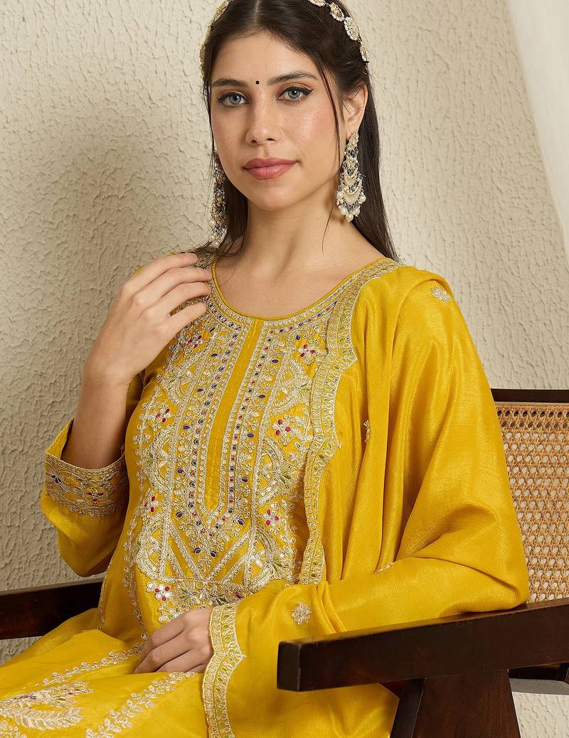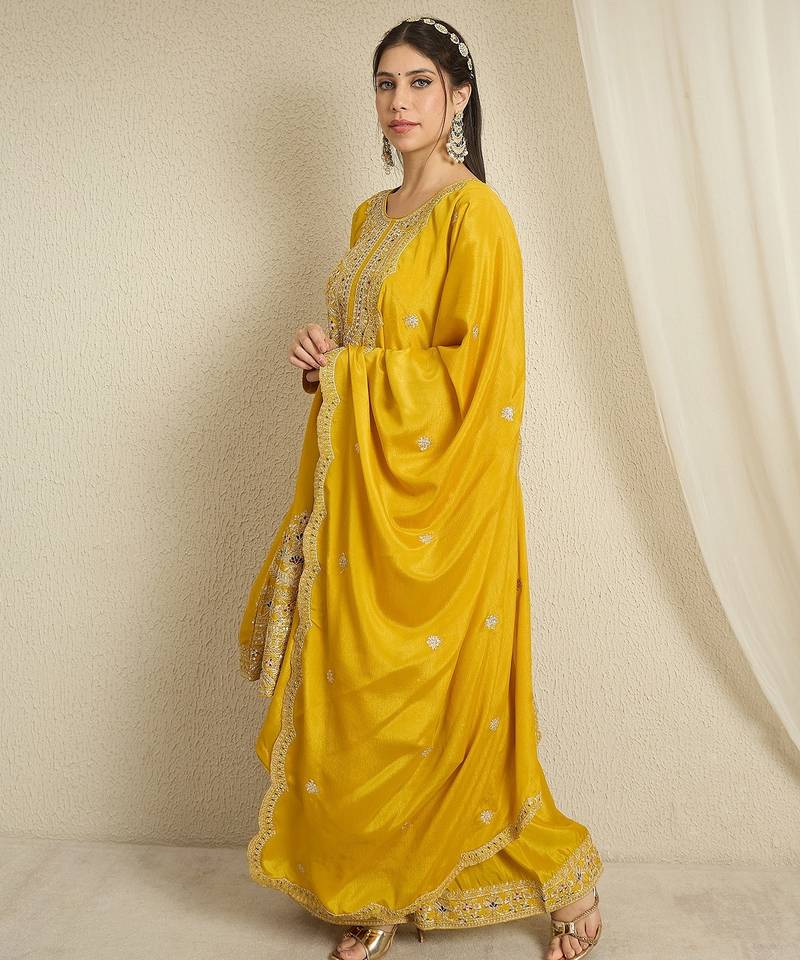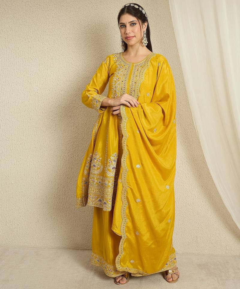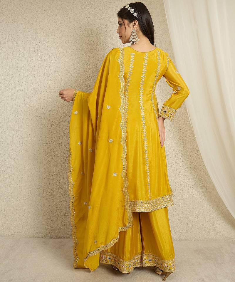 | Product Name | Yellow Chinon Top With Bottom And Dupatta Full Sleeve Embroidered Kurta Palazzo Set | |