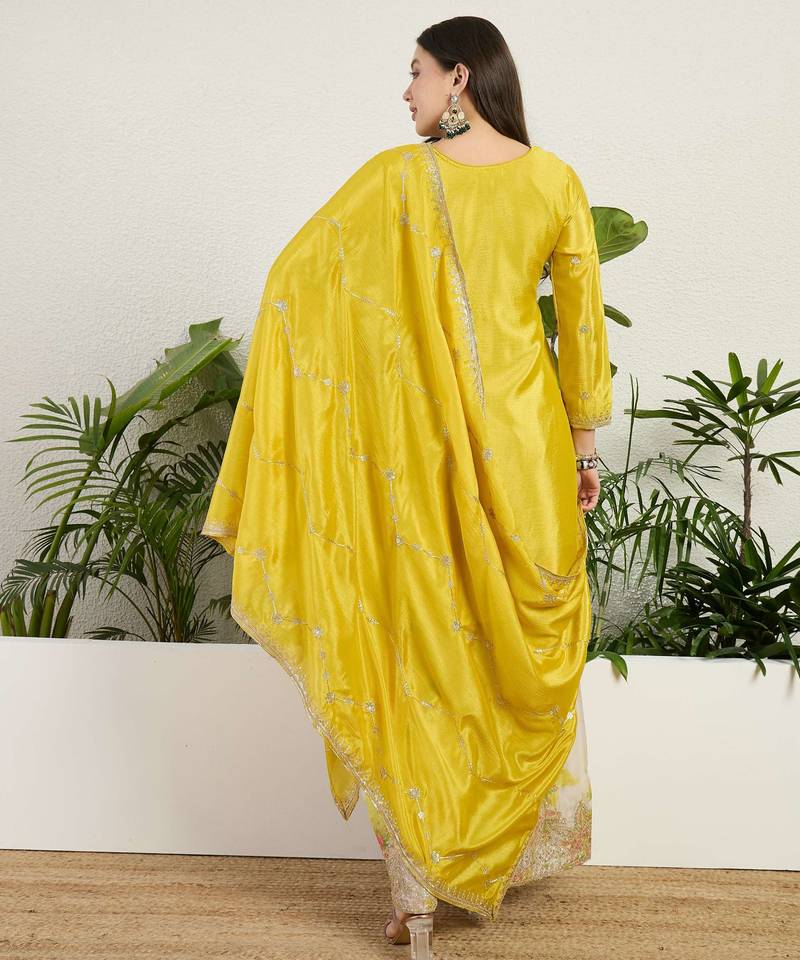 Elegant Yellow Straight Kurta Palazzo Set Crafted In Premium Chinon Fabric For A Vibrant And Graceful Ethnic Look.