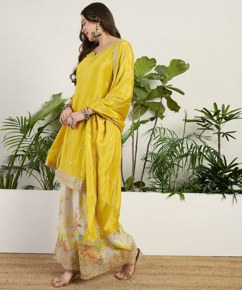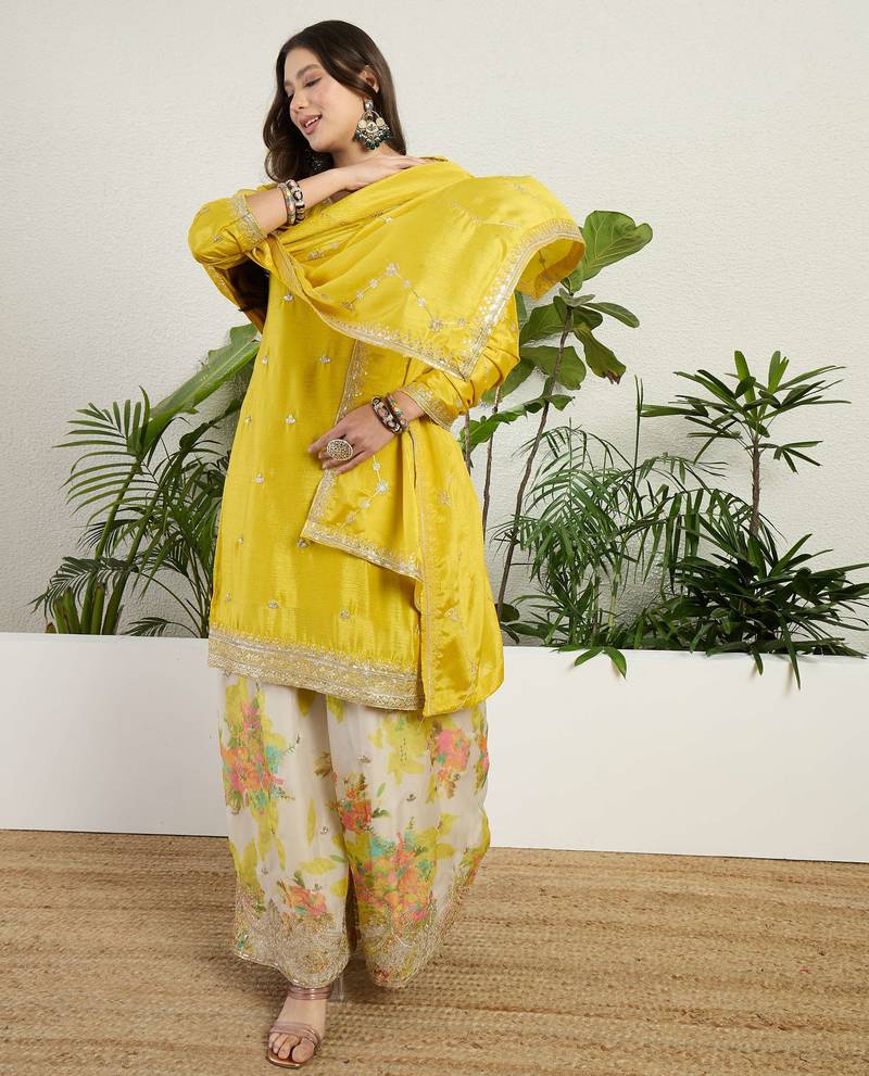 yellow chinon kurta palazzo set notch neck
