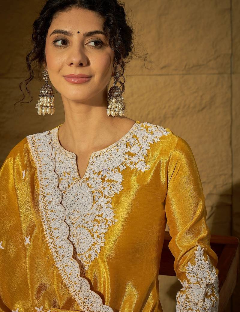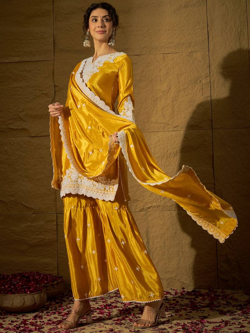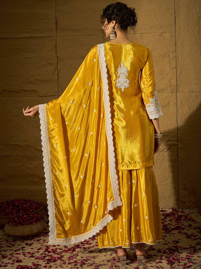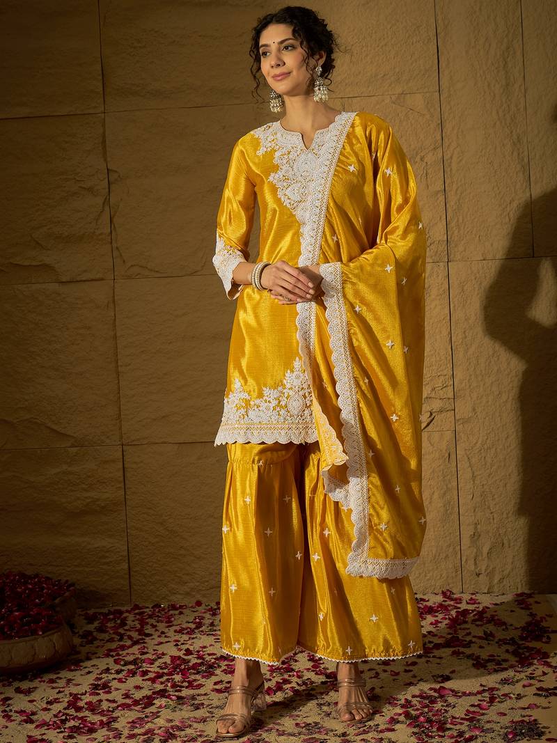 Product Name Yellow Embroidered Chinon Straight Kurta With Sharara & Dupatta Set For Women