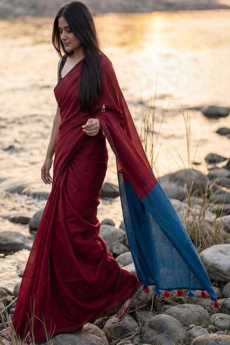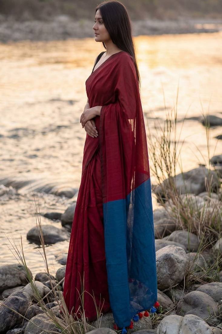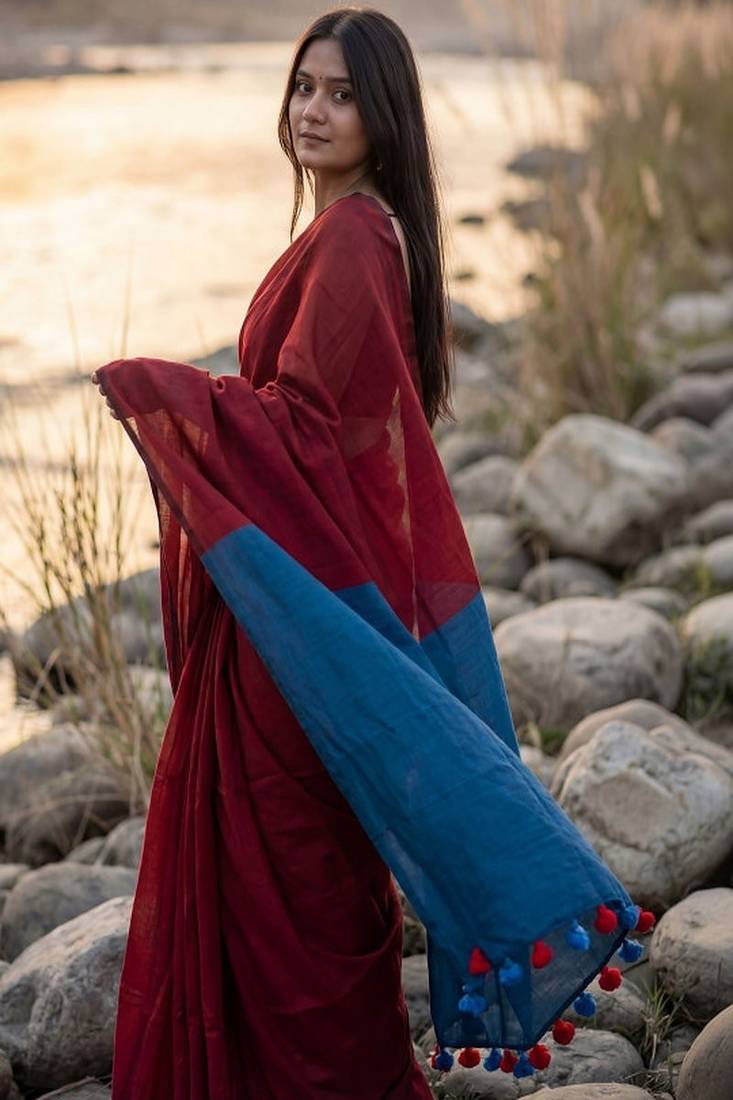 | • | Saree | : | Color- Maroon / Fabric- Pure Cotton |