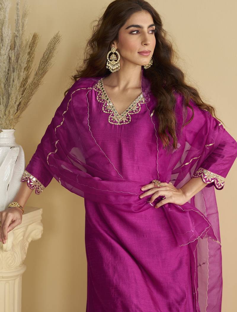 | Product Description | Bring Charm To Your Festive Style With This Elegant Outfit Crafted From Premium Real Silk. Designed For A Trendy Look, It Features A Beautifully Foil Mirror Work Top Paired With Comfortable Palazzo Pants. The Look Is Completed With A Delicate Embroidered Organza Dupatta, Adding A Touch Of Grace. Perfect For Celebrations, This Outfit Blends Tradition With Modern Comfort For Effortless Style. |