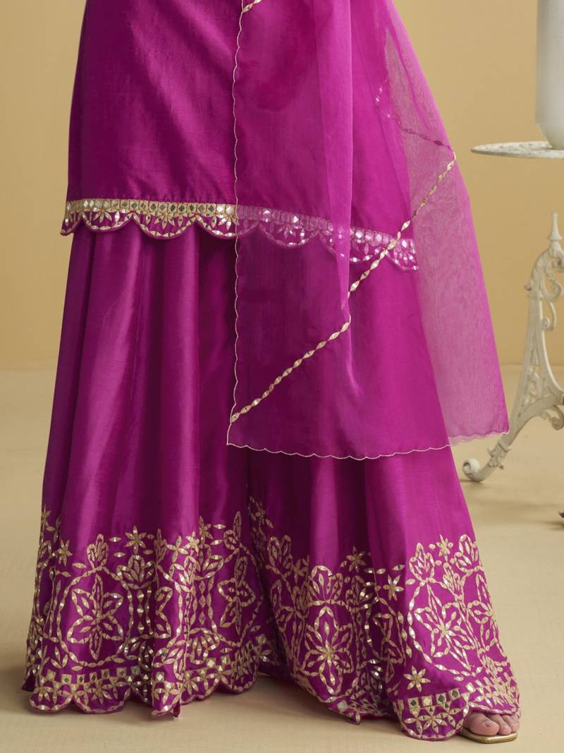 Dark pink mirror work silk semi-stitch palazzo suit with organza dupatta semi stitched