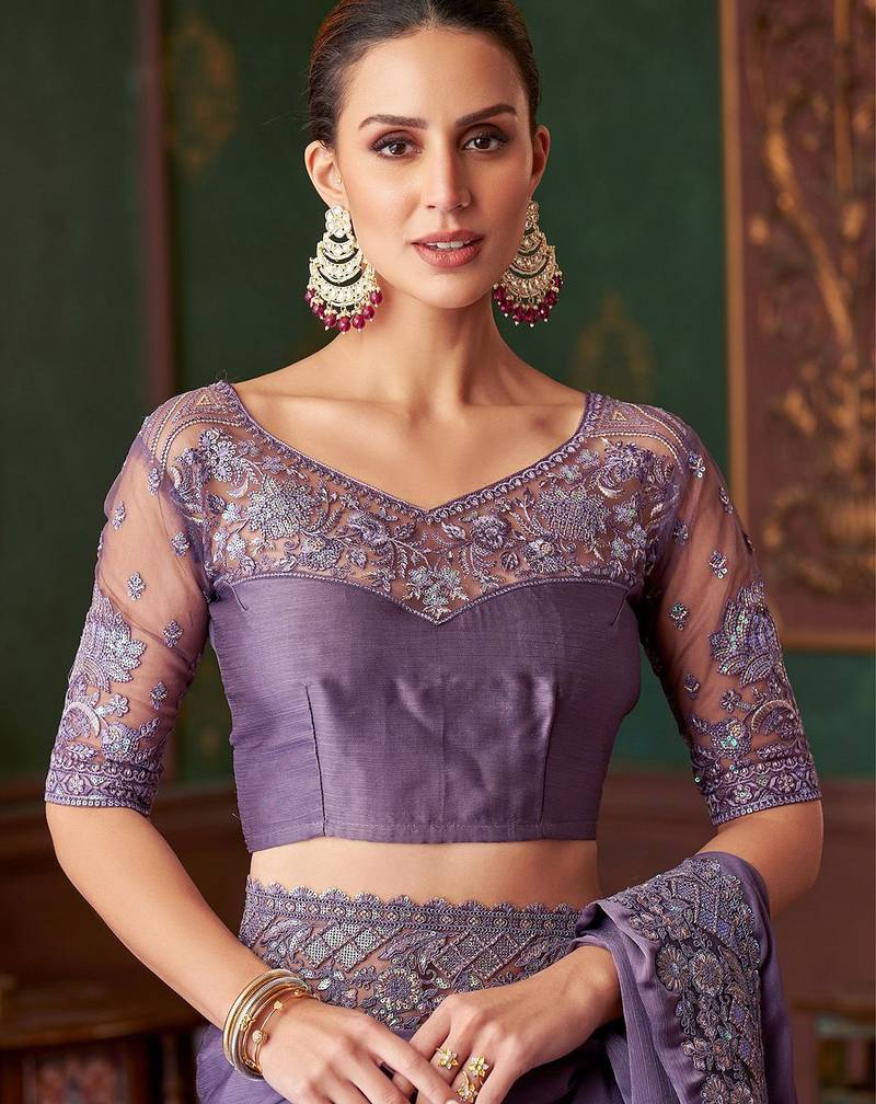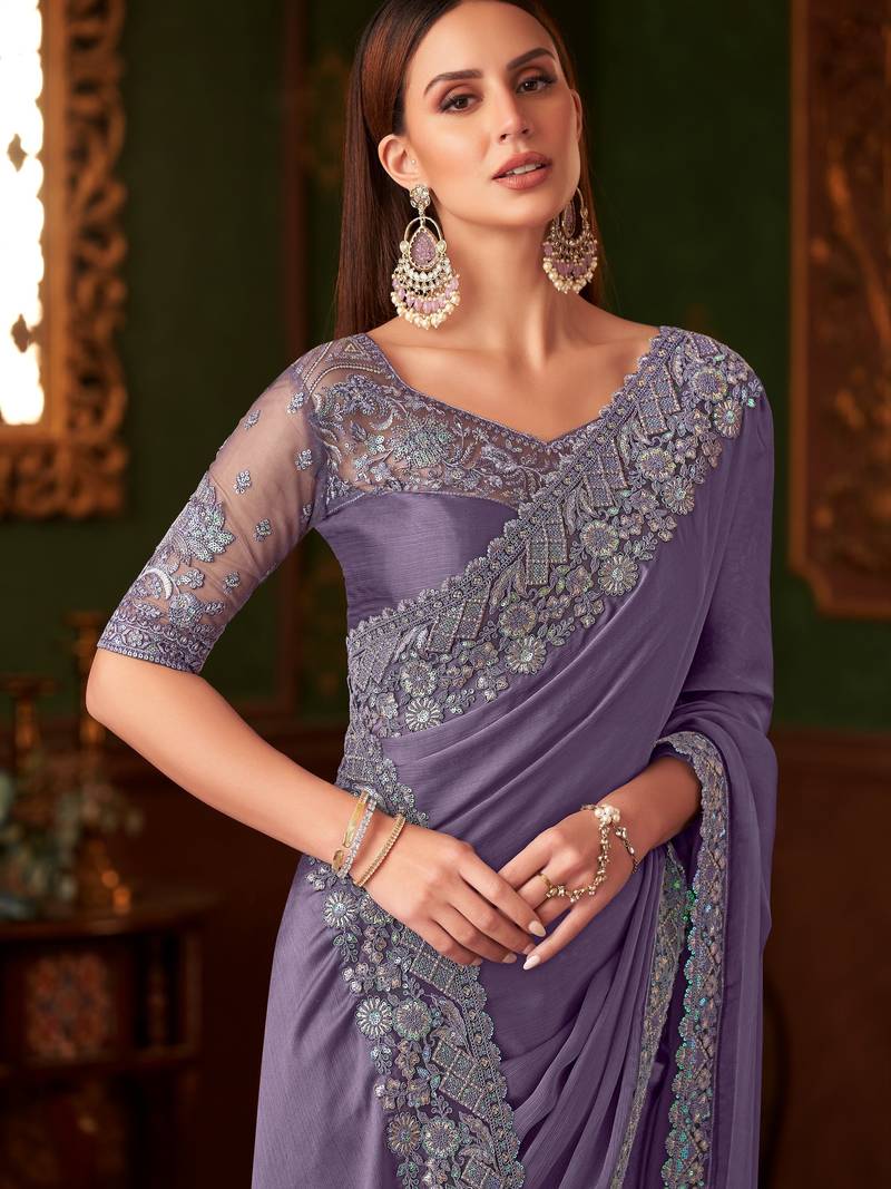 Light purple silk chiffon saree, lace border with heavy embroidered blouse for special occasions