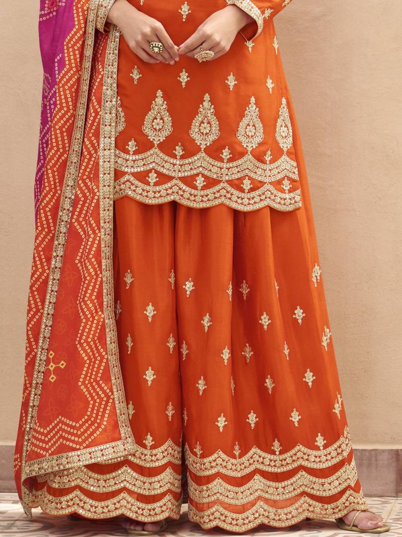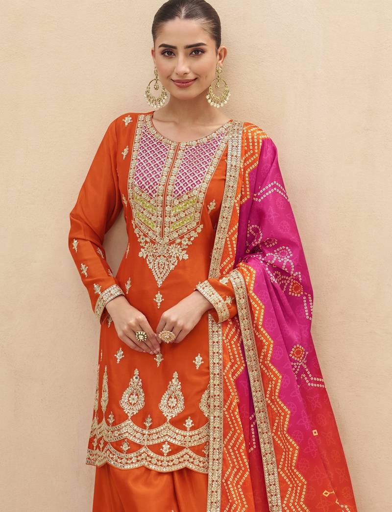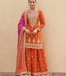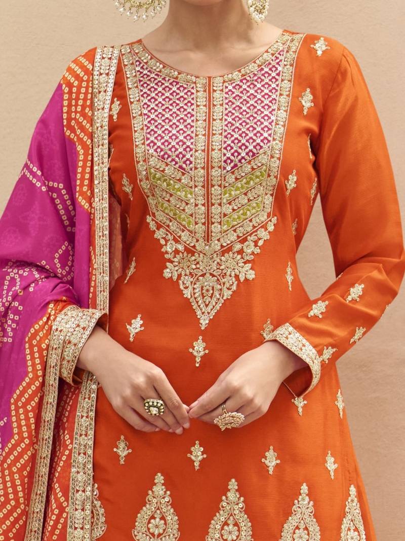 | Product Name | Orange Embroidered Chinnon Silk Semi Stitched Shara Suit With Dupatta | |