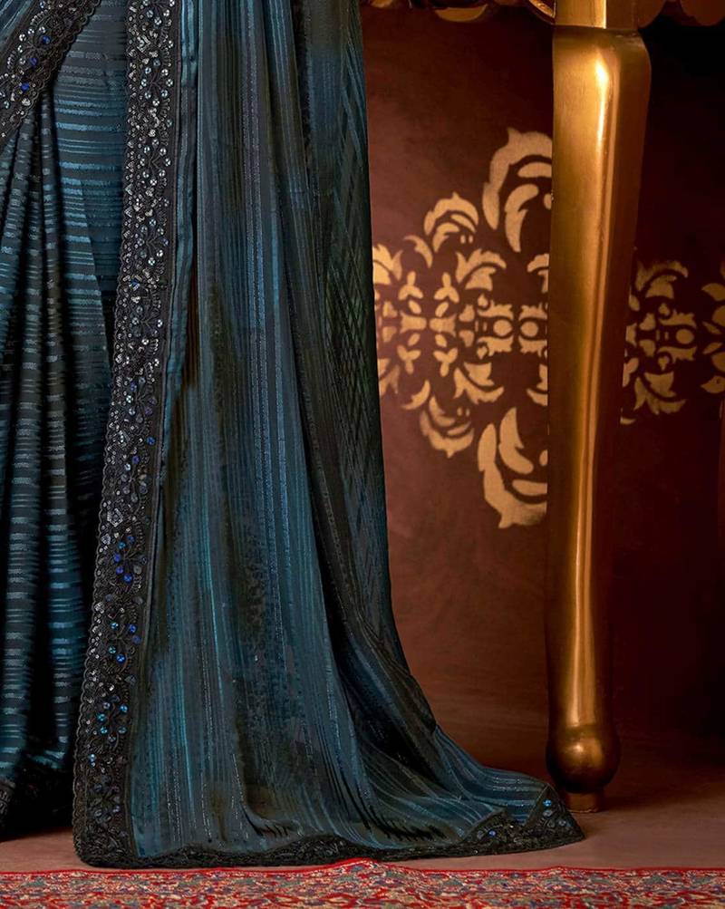 Teal blue black shaded silk saree, lace border with heavy embroidered blouse for special occasions