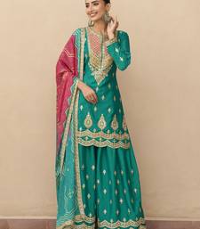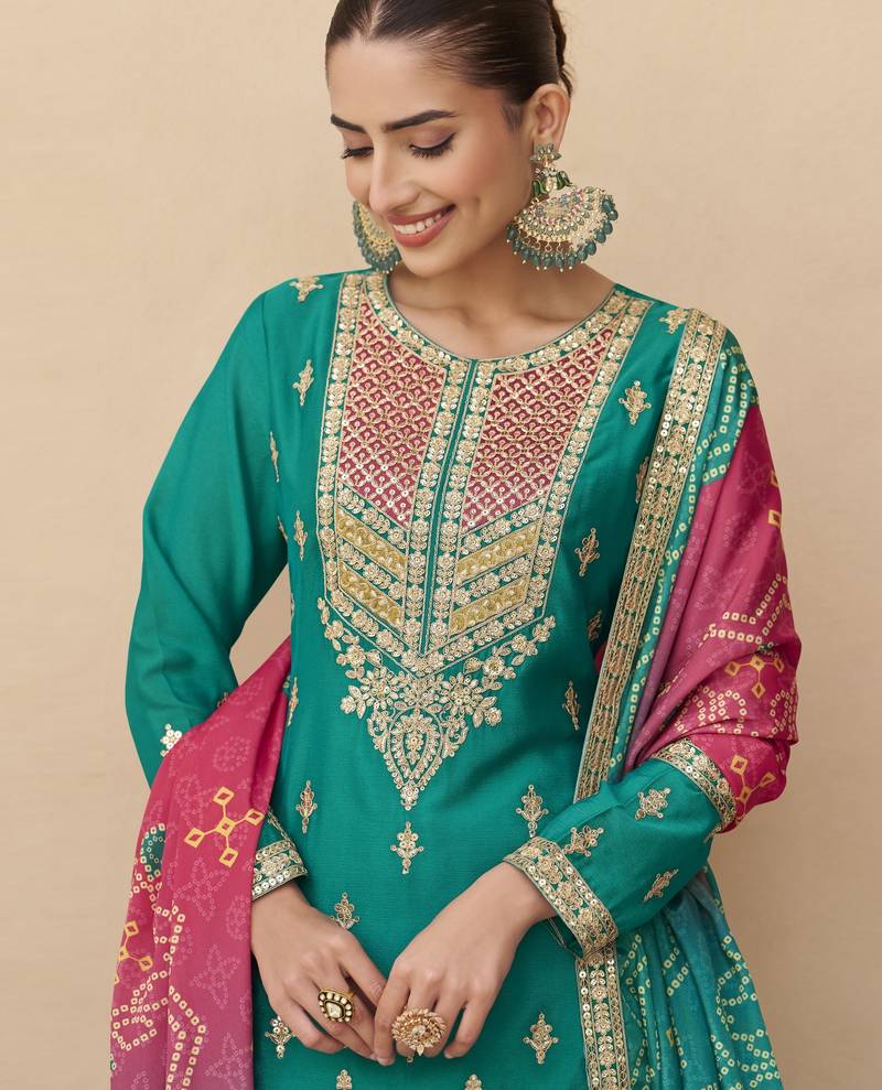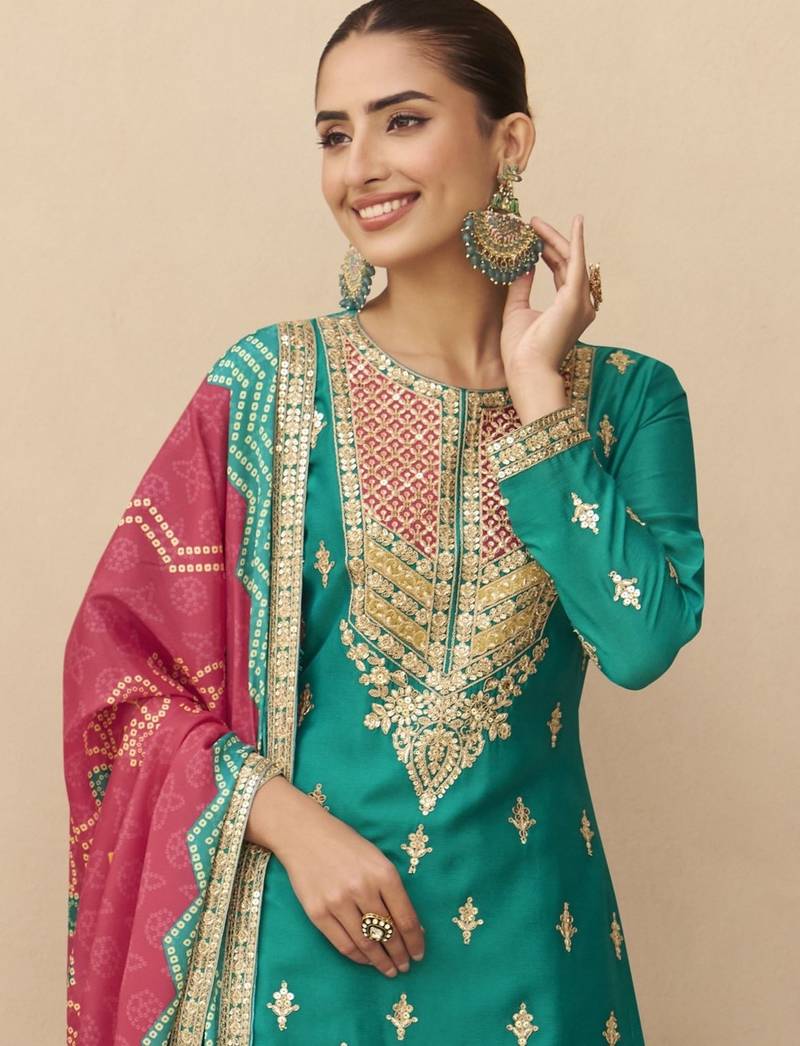 Product Name Teal Green Embroidered Chinnon Silk Semi Stitched Shara Suit With Dupatta