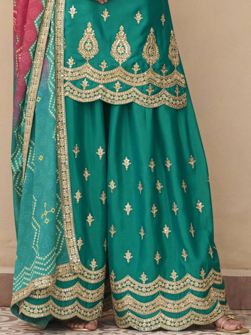Teal green embroidered chinnon silk semi-stitched shara suit with dupatta semi stitched
