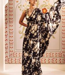 Black printed satin saree with blouse piece