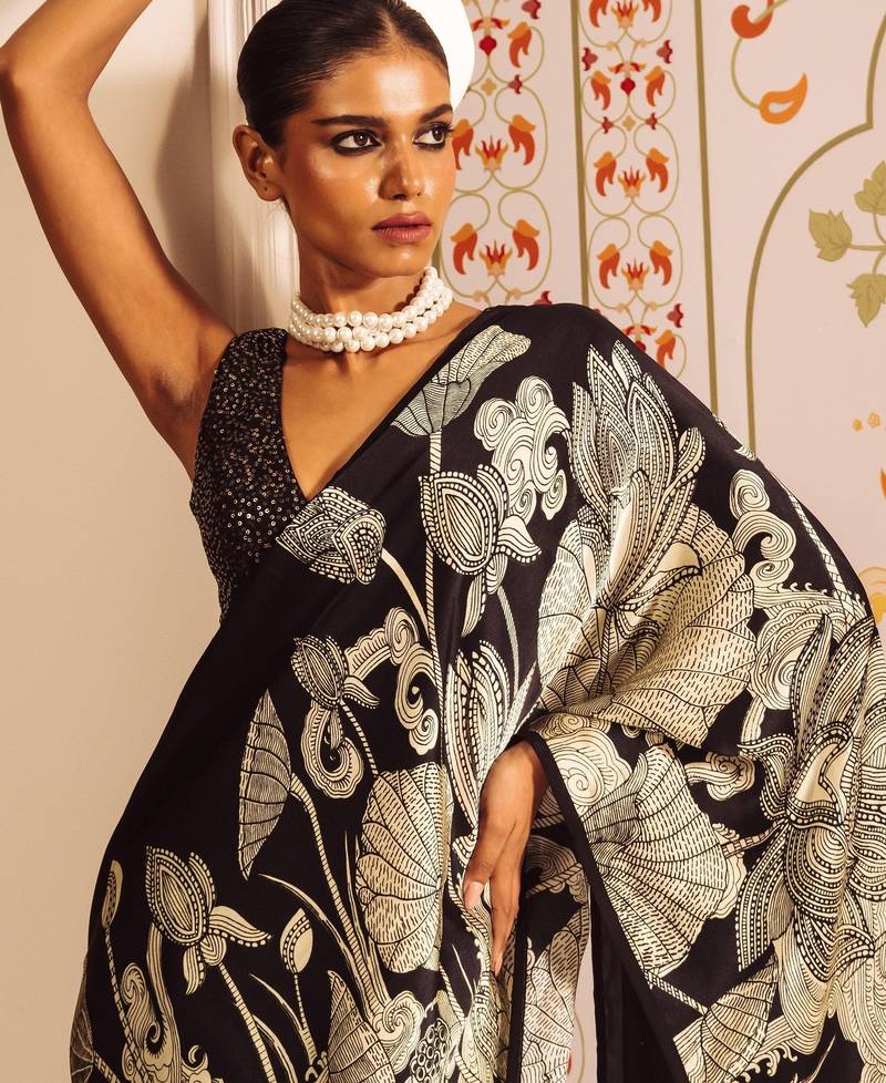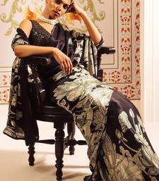 Black printed satin saree with blouse piece