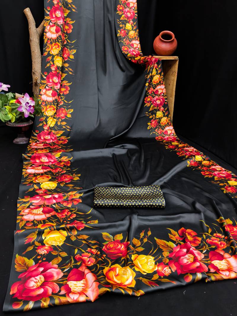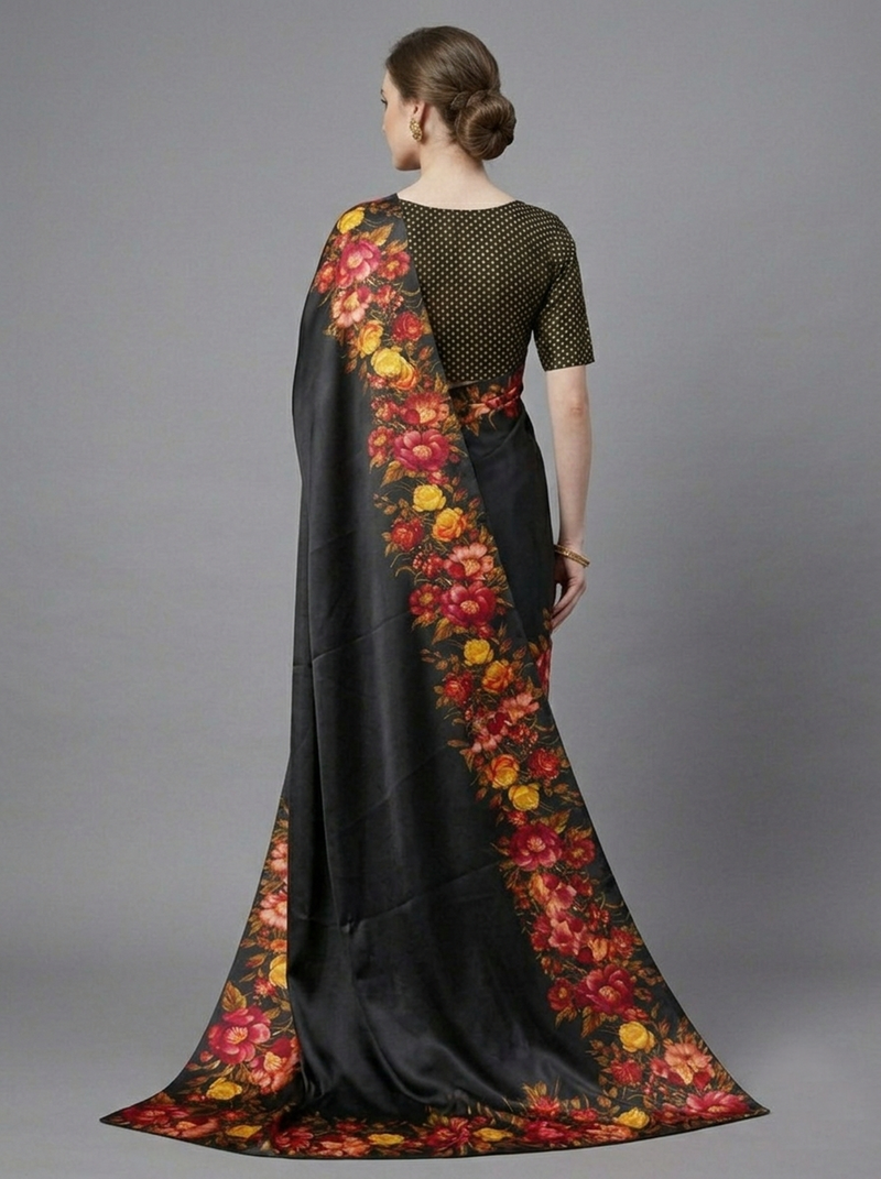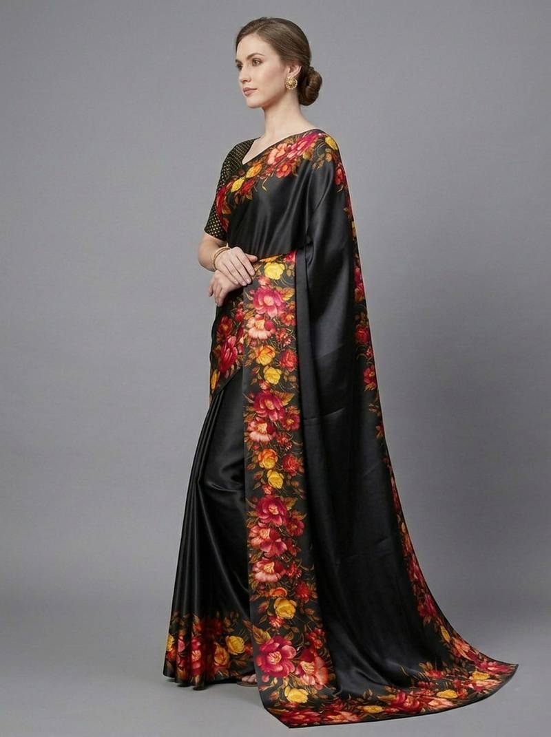 Elegant Satin Printed Saree Crafted With Floral Pattern Design. Saree Comes With Unstitched Satin Blouse Piece. Note: Please Refer Real Image Attached