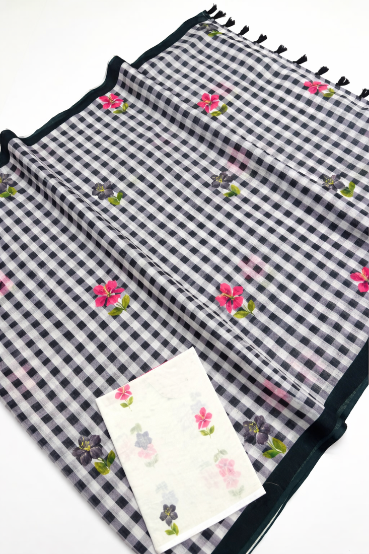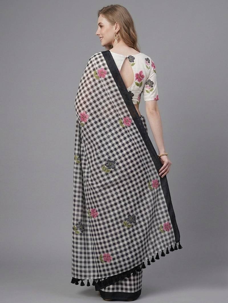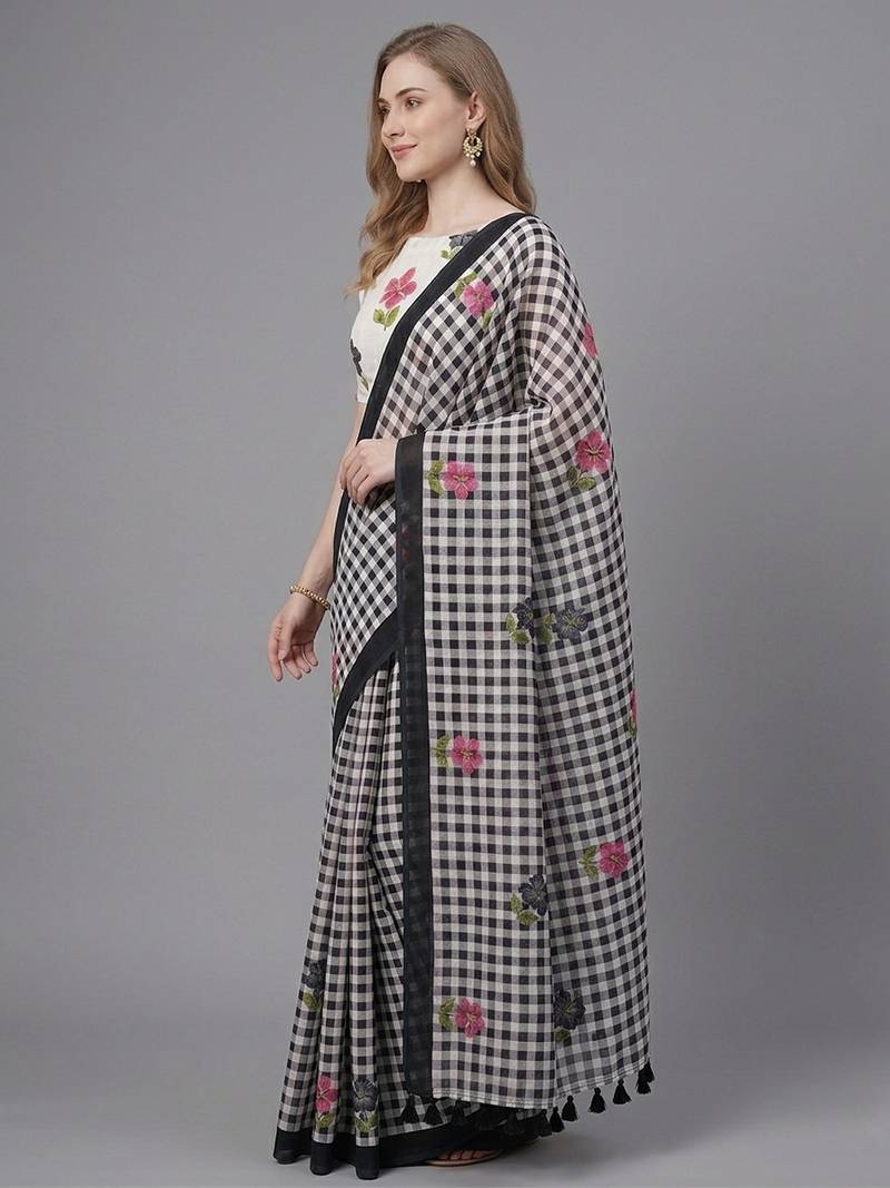 | Product Description | Elegant Linen Woven Saree Crafted With Checks & Floral Print. Saree Comes With Unstitched Linen Printed Blouse Piece. Note: Please Refer Real Image Attached |