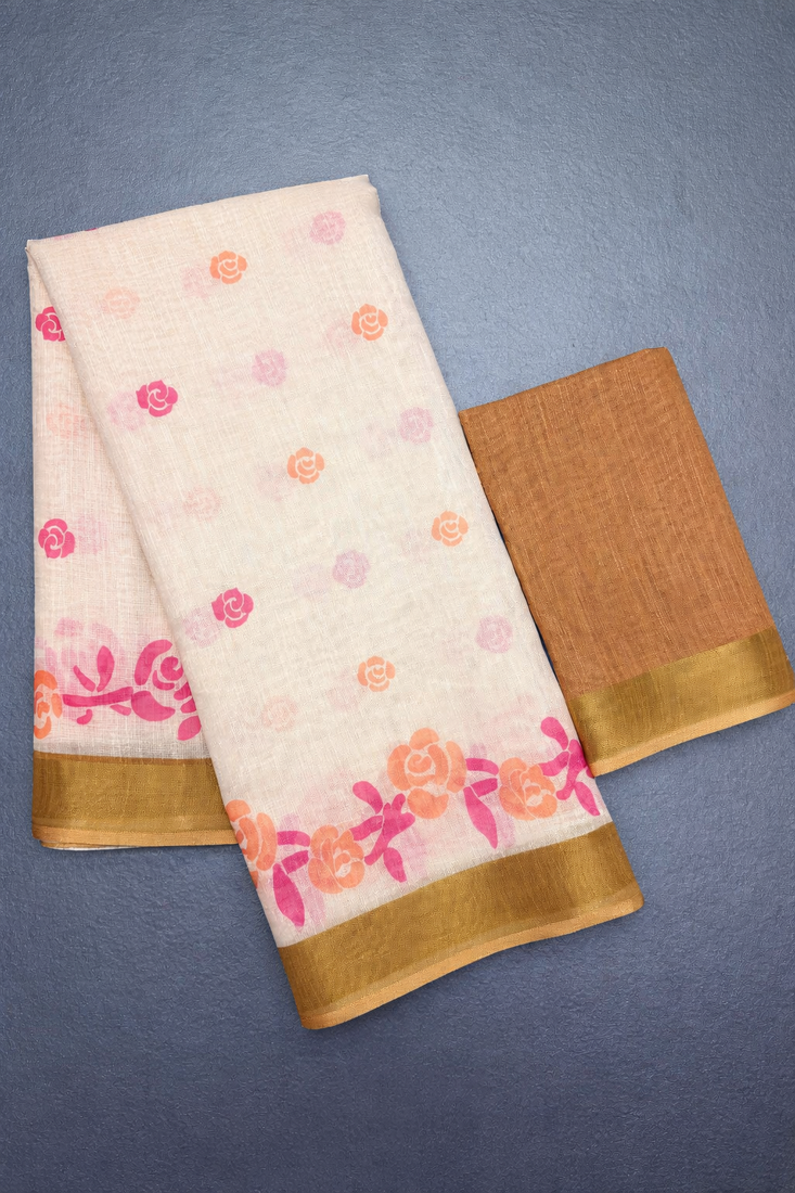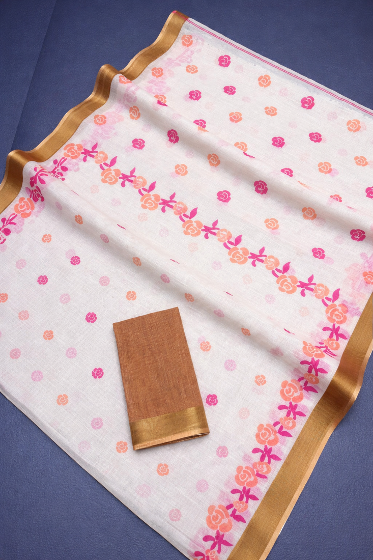 | Product Description | Elegant Linen Woven Saree Crafted With Floral Print. Saree Comes With Unstitched Linen Printed Blouse Piece. Note: Please Refer Real Image Attached |