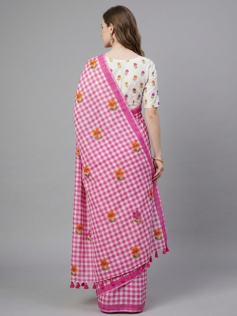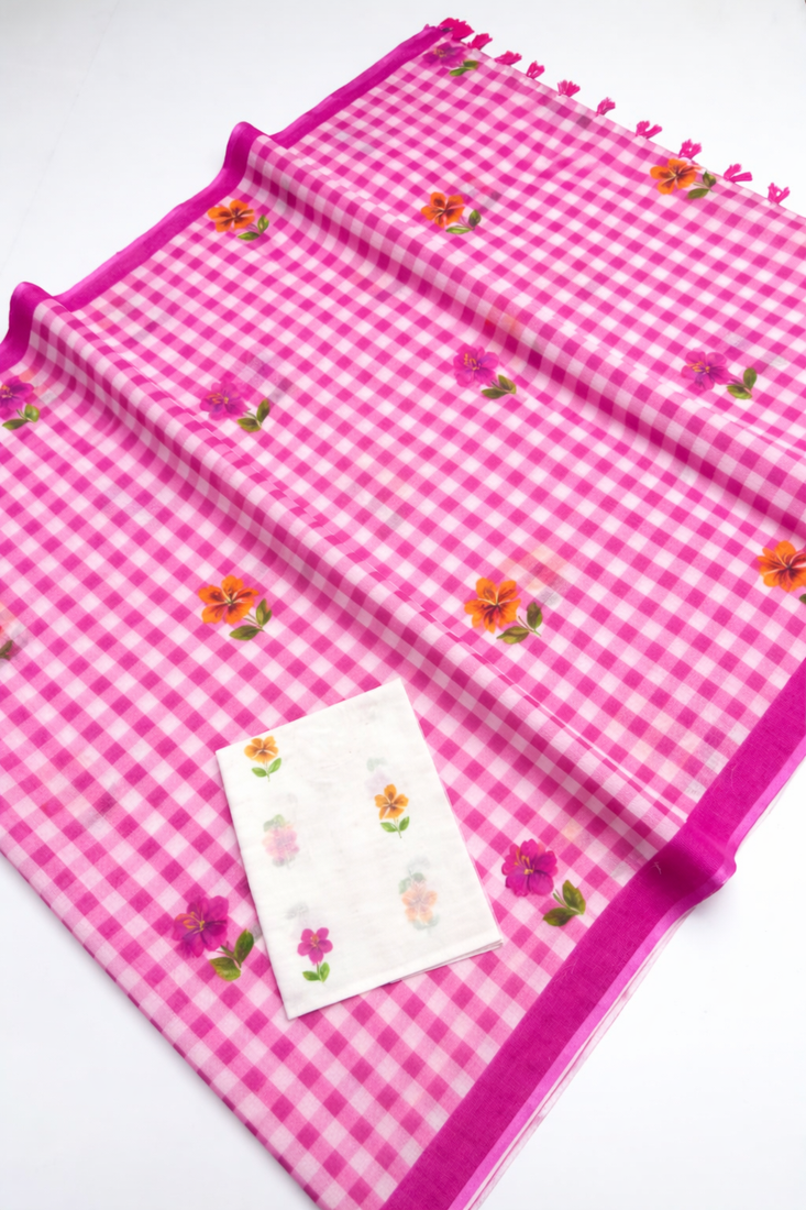 | Product Description | Elegant Linen Woven Saree Crafted With Checks & Floral Print. Saree Comes With Unstitched Linen Printed Blouse Piece. Note: Please Refer Real Image Attached |