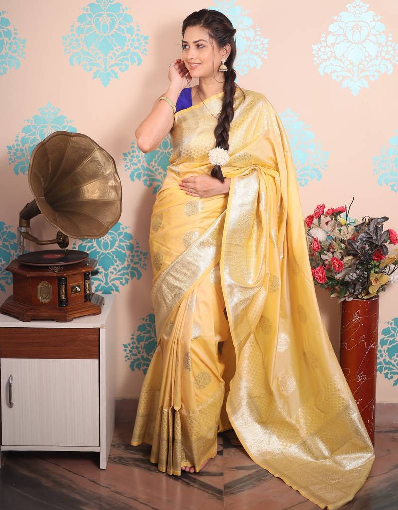 Yellow woven banarasi silk blend saree with blouse