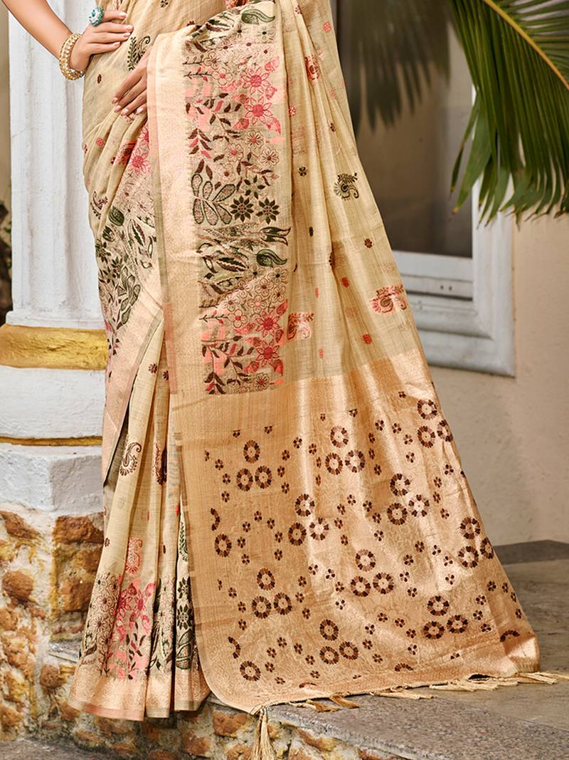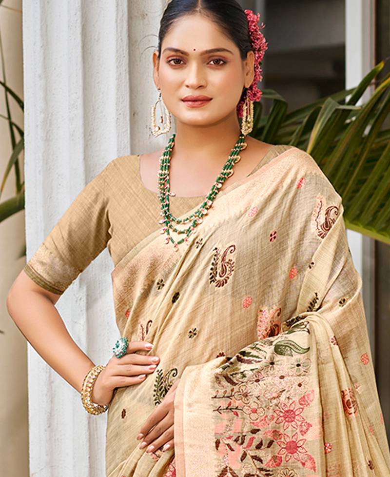Product Name Beige Cottan Silk Blend With Meena Woven Work Traditional Saree