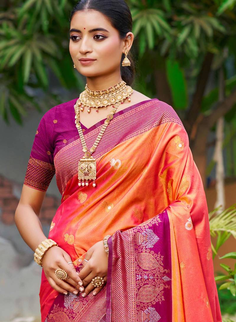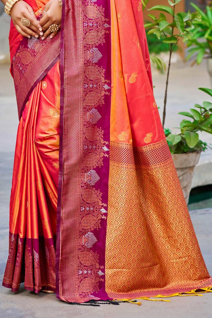 Coral orange soft silk woven work traditional saree