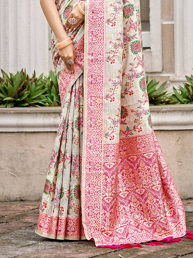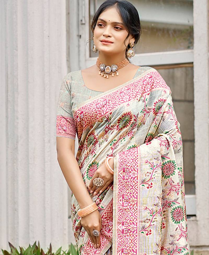 Cream cottan silk blend with meena woven work traditional saree