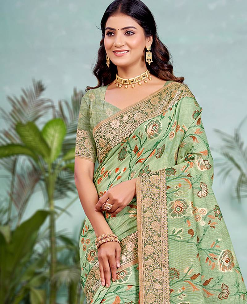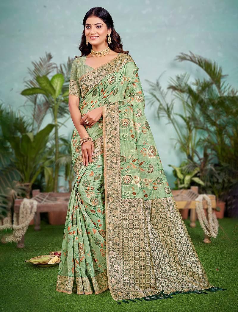 | Product Name | Light Green Cottan Silk Blend With Meena Woven Work Traditional Saree | |