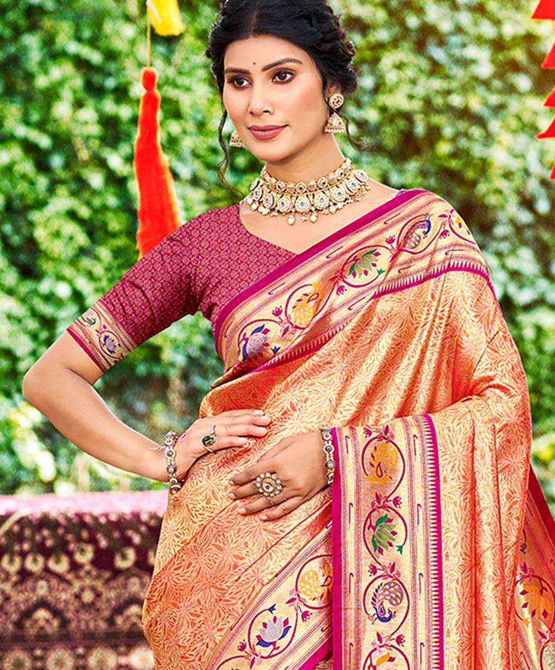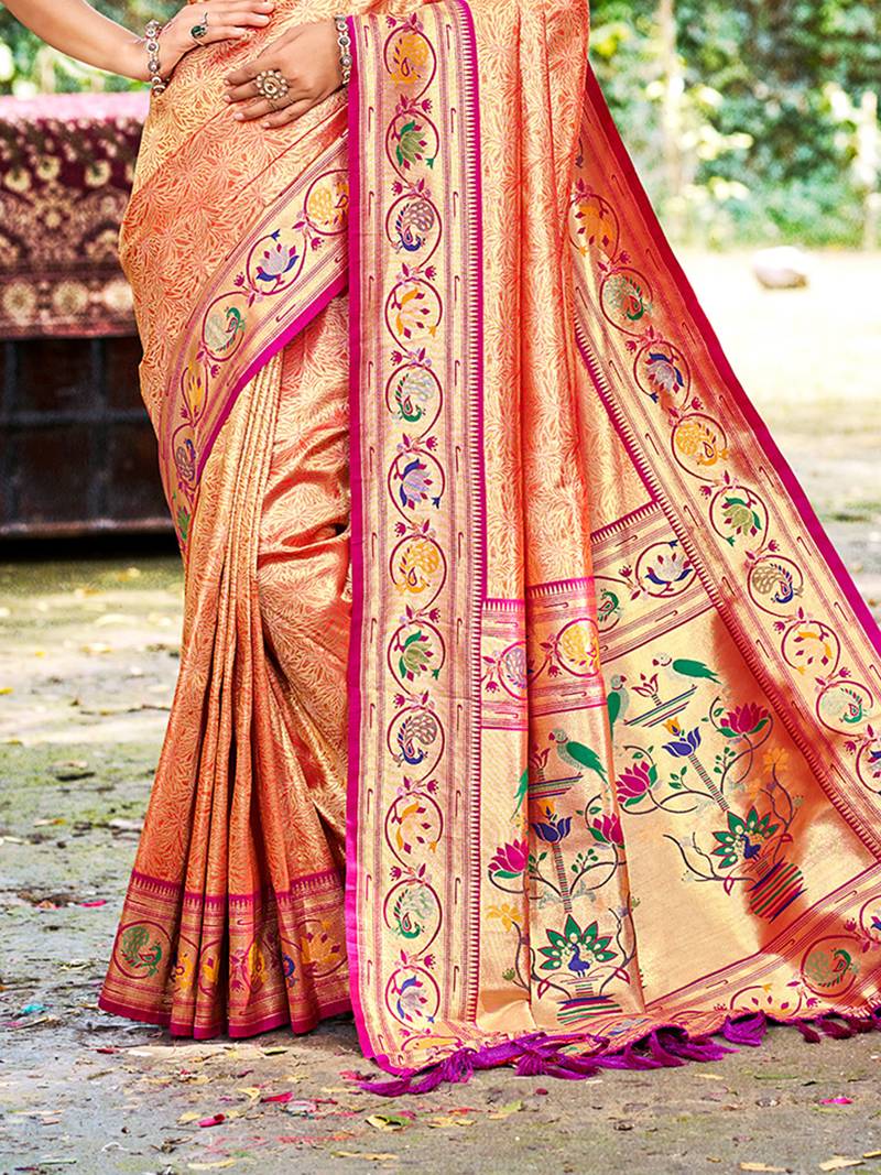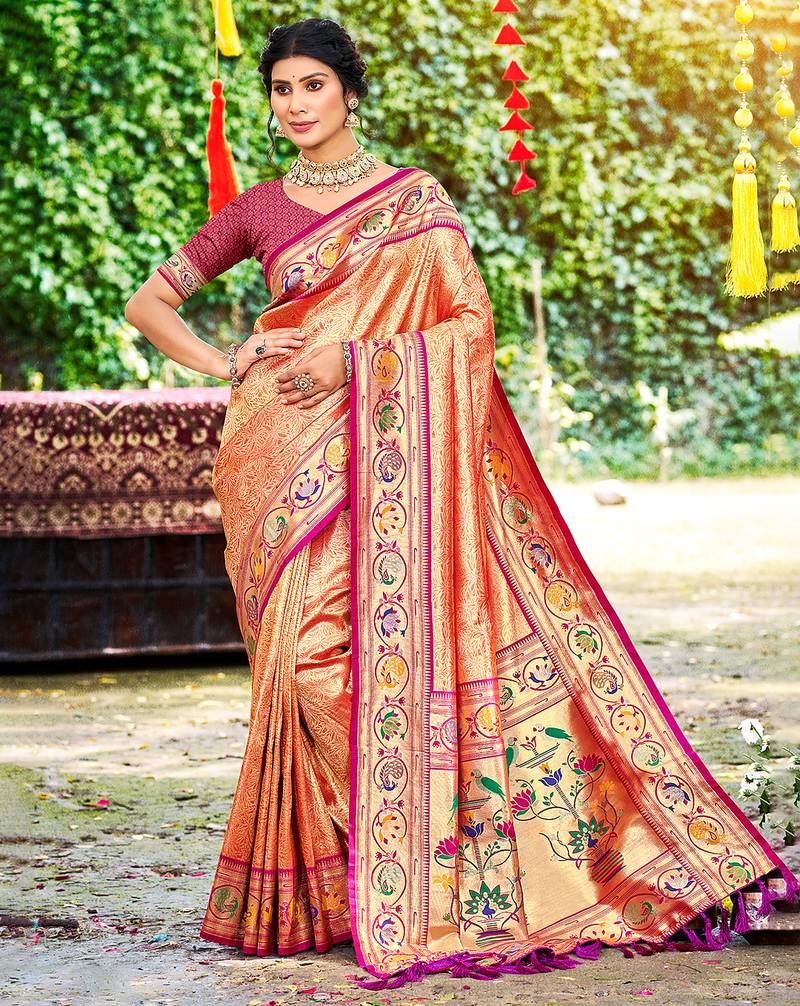 Orange silk blend woven work traditional saree