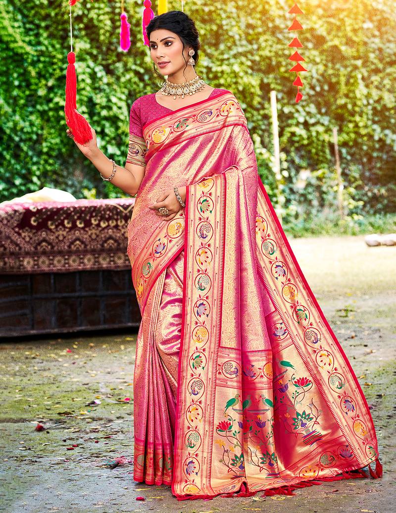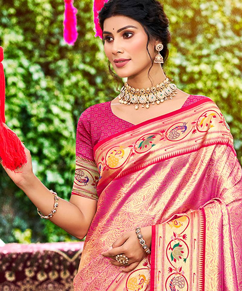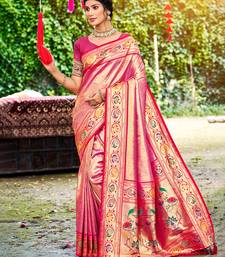 Pink silk blend woven work traditional saree