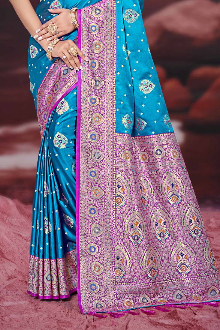 Teal blue silk blend woven work traditional saree