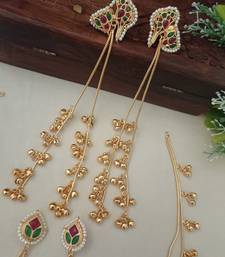 | Product Name | Brass Plated Kundan Peacock Kashmiri Multi Drop Ghungaroo Earrings With Earchains | |