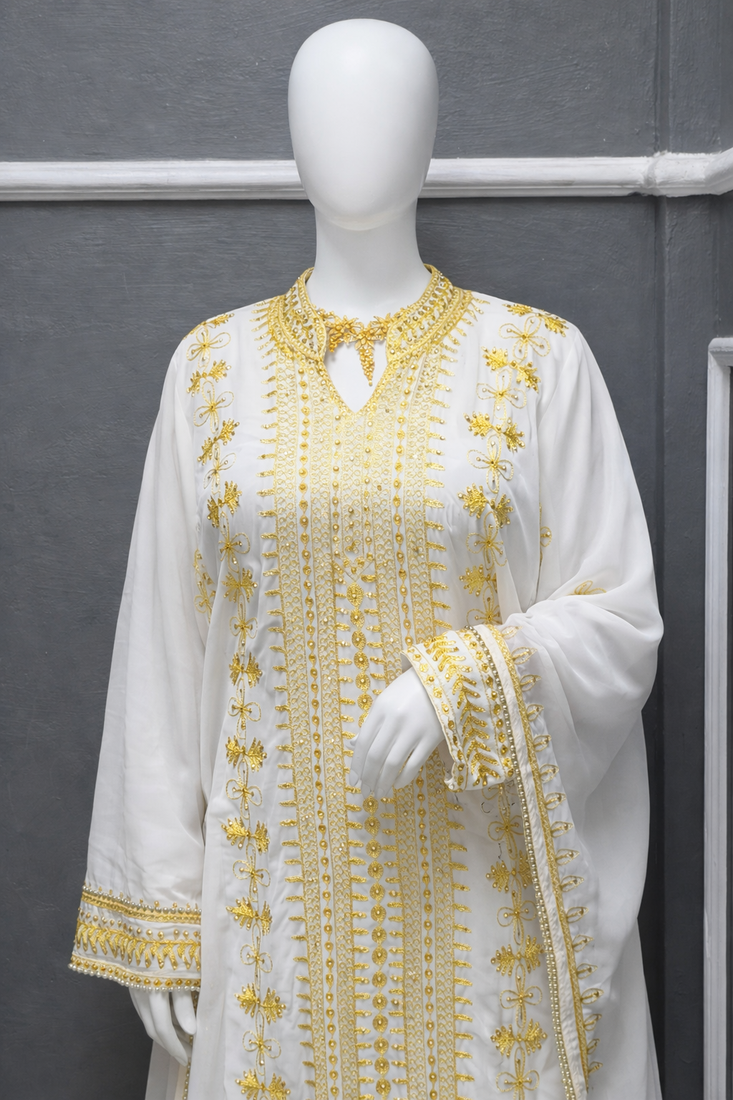 | Product Description | This Breathtaking Kaftan Gown Captures The Essence Of Luxury Event Wear, Ideal For Weddings, Receptions, And Gala Evenings. Made From Soft, Flowing Georgette, It Falls Beautifully To A Full Length Silhouette And Features A Flattering V Neckline That Adds A Touch Of Modern Grace. Every Inch Of The Gown Is Richly Detailed With Intricate Gold And Silver Toned Hand Embroidery, Highlighted By Delicate Sparkling Embellishments Arranged In A Traditional Pattern. The Flowing Split Batwing Style Cape Sleeves Drape Elegantly To The Floor, Creating A Sense Of Movement And Regal Charm. Designed To Turn Heads, This Piece Is Perfect For Making A Lasting Impression At Any Grand Occasion. |