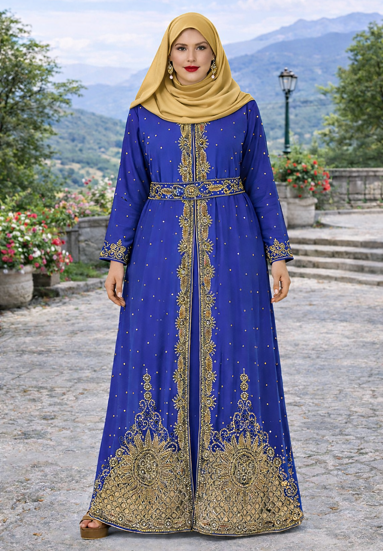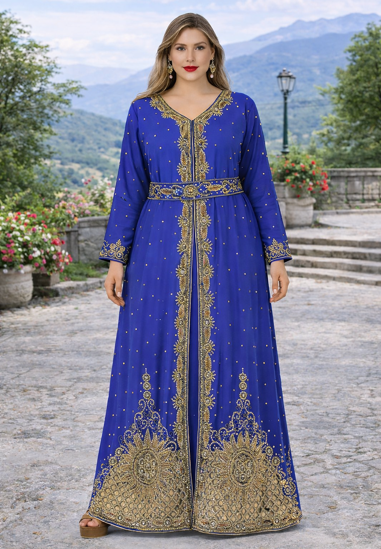 | Product Description | This Breathtaking Kaftan Gown Captures The Essence Of Luxury Event Wear, Ideal For Weddings, Receptions, And Gala Evenings. Made From Soft, Flowing Georgette, It Falls Beautifully To A Full Length Silhouette And Features A Flattering V Neckline That Adds A Touch Of Modern Grace. Every Inch Of The Gown Is Richly Detailed With Intricate Gold And Silver Toned Hand Embroidery, Highlighted By Delicate Sparkling Embellishments Arranged In A Traditional Pattern. The Flowing Split Batwing Style Cape Sleeves Drape Elegantly To The Floor, Creating A Sense Of Movement And Regal Charm. Designed To Turn Heads, This Piece Is Perfect For Making A Lasting Impression At Any Grand Occasion. |