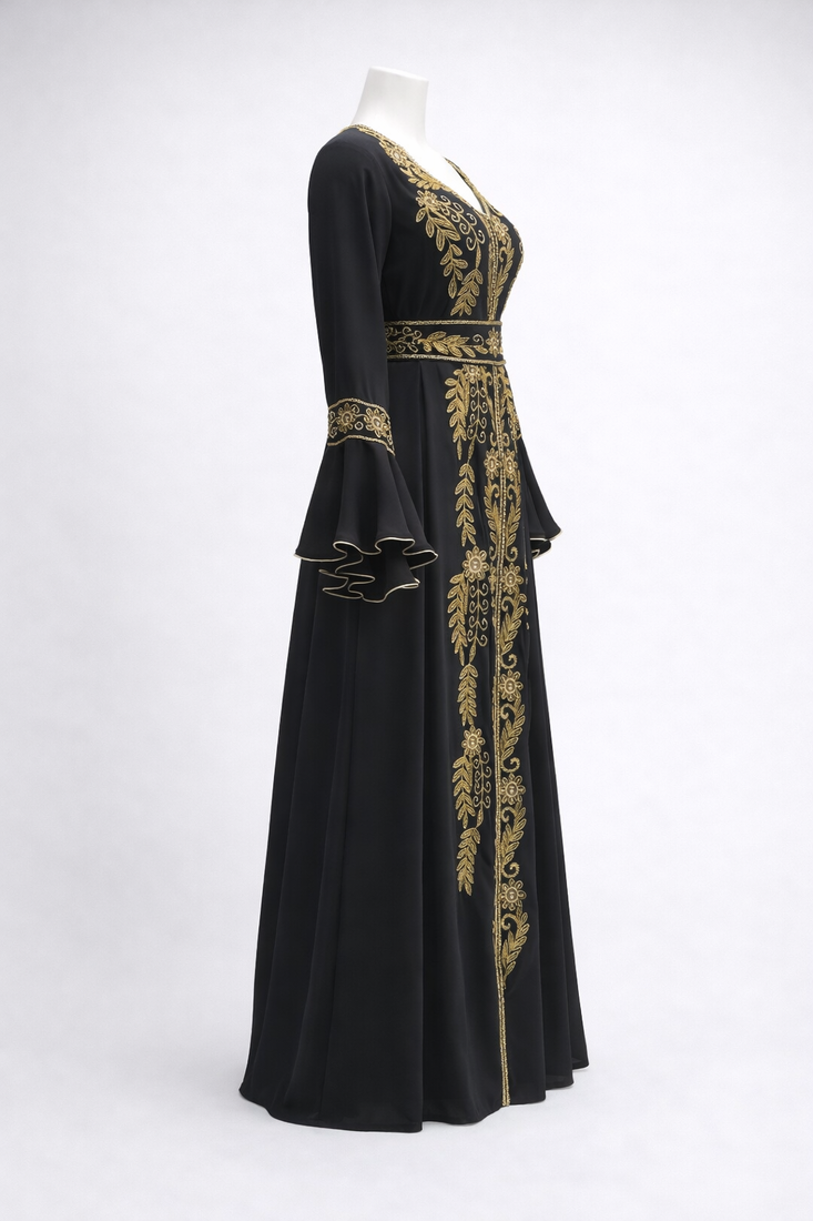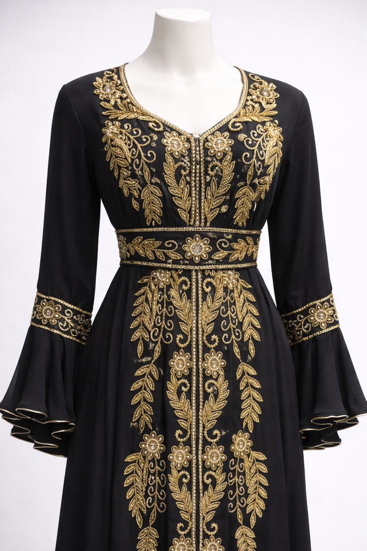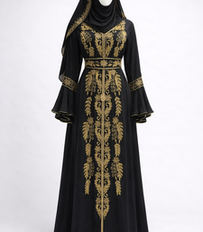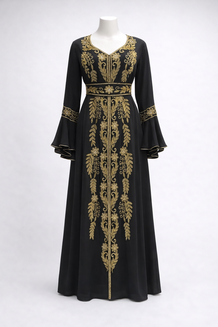 | Product Description | This Breathtaking Kaftan Gown Captures The Essence Of Luxury Event Wear, Ideal For Weddings, Receptions, And Gala Evenings. Made From Soft, Flowing Georgette, It Falls Beautifully To A Full Length Silhouette And Features A Flattering V Neckline That Adds A Touch Of Modern Grace. Every Inch Of The Gown Is Richly Detailed With Intricate Gold And Silver Toned Hand Embroidery, Highlighted By Delicate Sparkling Embellishments Arranged In A Traditional Pattern. The Flowing Split Batwing Style Cape Sleeves Drape Elegantly To The Floor, Creating A Sense Of Movement And Regal Charm. Designed To Turn Heads, This Piece Is Perfect For Making A Lasting Impression At Any Grand Occasion. |