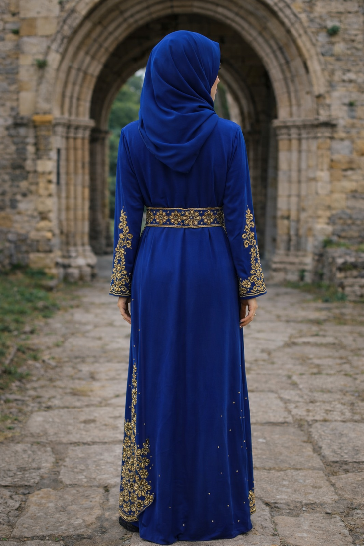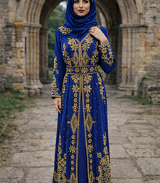| Product Description | This Breathtaking Kaftan Gown Captures The Essence Of Luxury Event Wear, Ideal For Weddings, Receptions, And Gala Evenings. Made From Soft, Flowing Georgette, It Falls Beautifully To A Full Length Silhouette And Features A Flattering V Neckline That Adds A Touch Of Modern Grace. Every Inch Of The Gown Is Richly Detailed With Intricate Gold And Silver Toned Hand Embroidery, Highlighted By Delicate Sparkling Embellishments Arranged In A Traditional Pattern. The Flowing Split Batwing Style Cape Sleeves Drape Elegantly To The Floor, Creating A Sense Of Movement And Regal Charm. Designed To Turn Heads, This Piece Is Perfect For Making A Lasting Impression At Any Grand Occasion. |