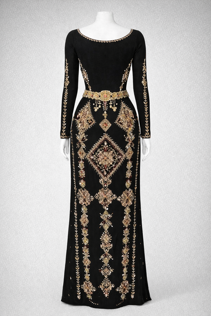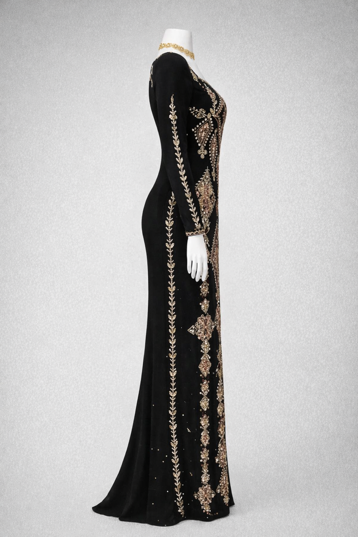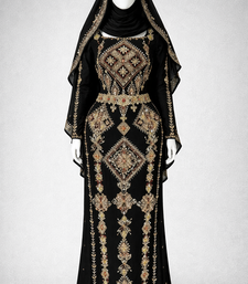 | Product Description | This Breathtaking Sky Blue Kaftan Gown Captures The Essence Of Luxury Event Wear, Ideal For Weddings, Receptions, And Gala Evenings. Made From Soft, Flowing Georgette, It Falls Beautifully To A Full Length Silhouette And Features A Flattering V Neckline That Adds A Touch Of Modern Grace. Every Inch Of The Gown Is Richly Detailed With Intricate Gold And Silver Toned Hand Embroidery, Highlighted By Delicate Sparkling Embellishments Arranged In A Traditional Pattern. The Flowing Split Batwing Style Cape Sleeves Drape Elegantly To The Floor, Creating A Sense Of Movement And Regal Charm. Designed To Turn Heads, This Piece Is Perfect For Making A Lasting Impression At Any Grand Occasion. |