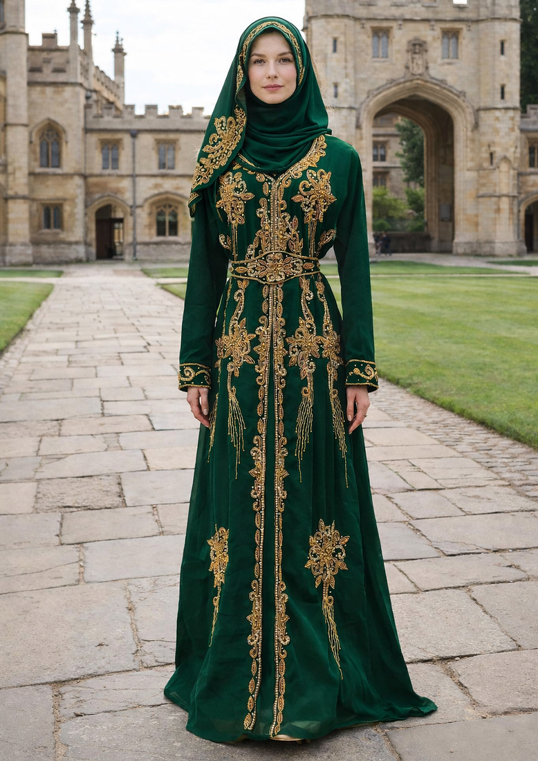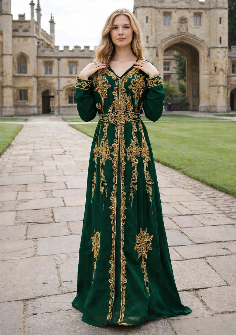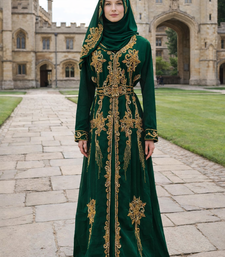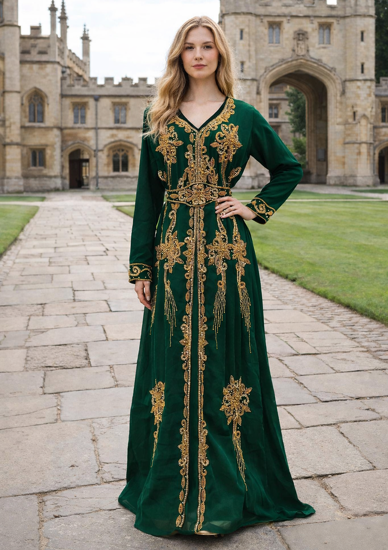 | Product Description | This Breathtaking Kaftan Gown Captures The Essence Of Luxury Event Wear, Ideal For Weddings, Receptions, And Gala Evenings. Made From Soft, Flowing Georgette, It Falls Beautifully To A Full Length Silhouette And Features A Flattering V Neckline That Adds A Touch Of Modern Grace. Every Inch Of The Gown Is Richly Detailed With Intricate Gold And Silver Toned Hand Embroidery, Highlighted By Delicate Sparkling Embellishments Arranged In A Traditional Pattern. The Flowing Split Batwing Style Cape Sleeves Drape Elegantly To The Floor, Creating A Sense Of Movement And Regal Charm. Designed To Turn Heads, This Piece Is Perfect For Making A Lasting Impression At Any Grand Occasion. |