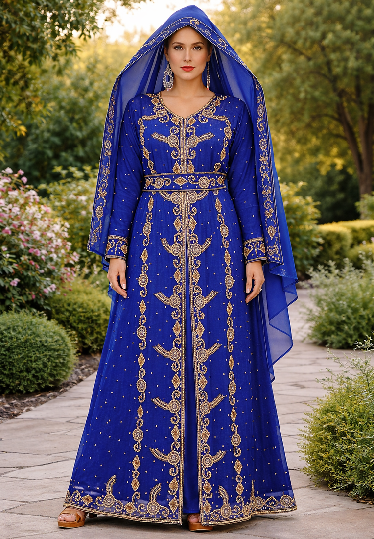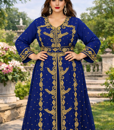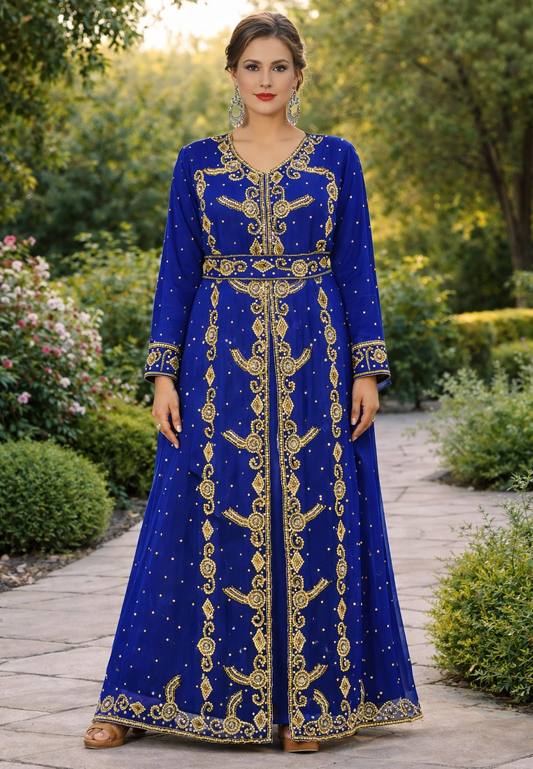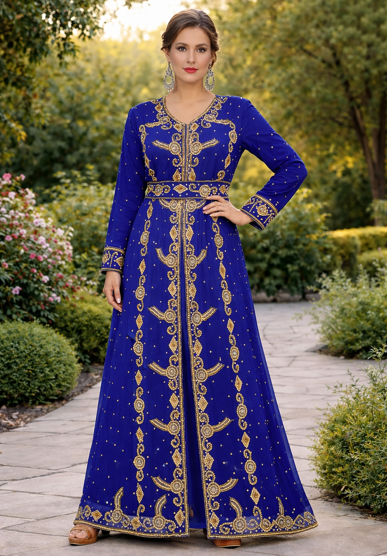 | Product Description | This Breathtaking Kaftan Gown Captures The Essence Of Luxury Event Wear, Ideal For Weddings, Receptions, And Gala Evenings. Made From Soft, Flowing Georgette, It Falls Beautifully To A Full Length Silhouette And Features A Flattering V Neckline That Adds A Touch Of Modern Grace. Every Inch Of The Gown Is Richly Detailed With Intricate Gold And Silver Toned Hand Embroidery, Highlighted By Delicate Sparkling Embellishments Arranged In A Traditional Pattern. The Flowing Split Batwing Style Cape Sleeves Drape Elegantly To The Floor, Creating A Sense Of Movement And Regal Charm. Designed To Turn Heads, This Piece Is Perfect For Making A Lasting Impression At Any Grand Occasion. |