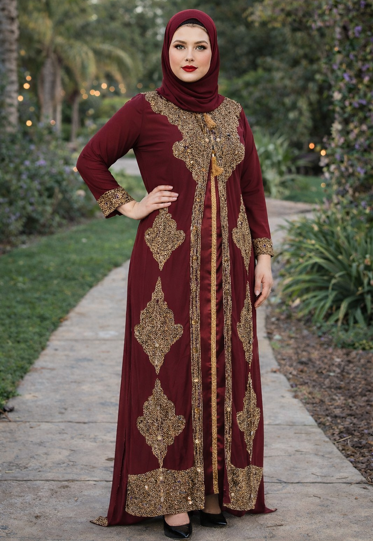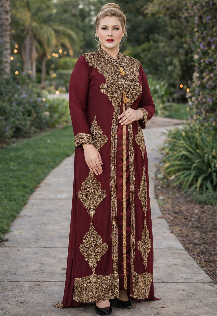 | Product Description | This Breathtaking Kaftan Gown Captures The Essence Of Luxury Event Wear, Ideal For Weddings, Receptions, And Gala Evenings. Made From Soft, Flowing Georgette, It Falls Beautifully To A Full Length Silhouette And Features A Flattering V Neckline That Adds A Touch Of Modern Grace. Every Inch Of The Gown Is Richly Detailed With Intricate Gold And Silver Toned Hand Embroidery, Highlighted By Delicate Sparkling Embellishments Arranged In A Traditional Pattern. The Flowing Split Batwing Style Cape Sleeves Drape Elegantly To The Floor, Creating A Sense Of Movement And Regal Charm. Designed To Turn Heads, This Piece Is Perfect For Making A Lasting Impression At Any Grand Occasion. |