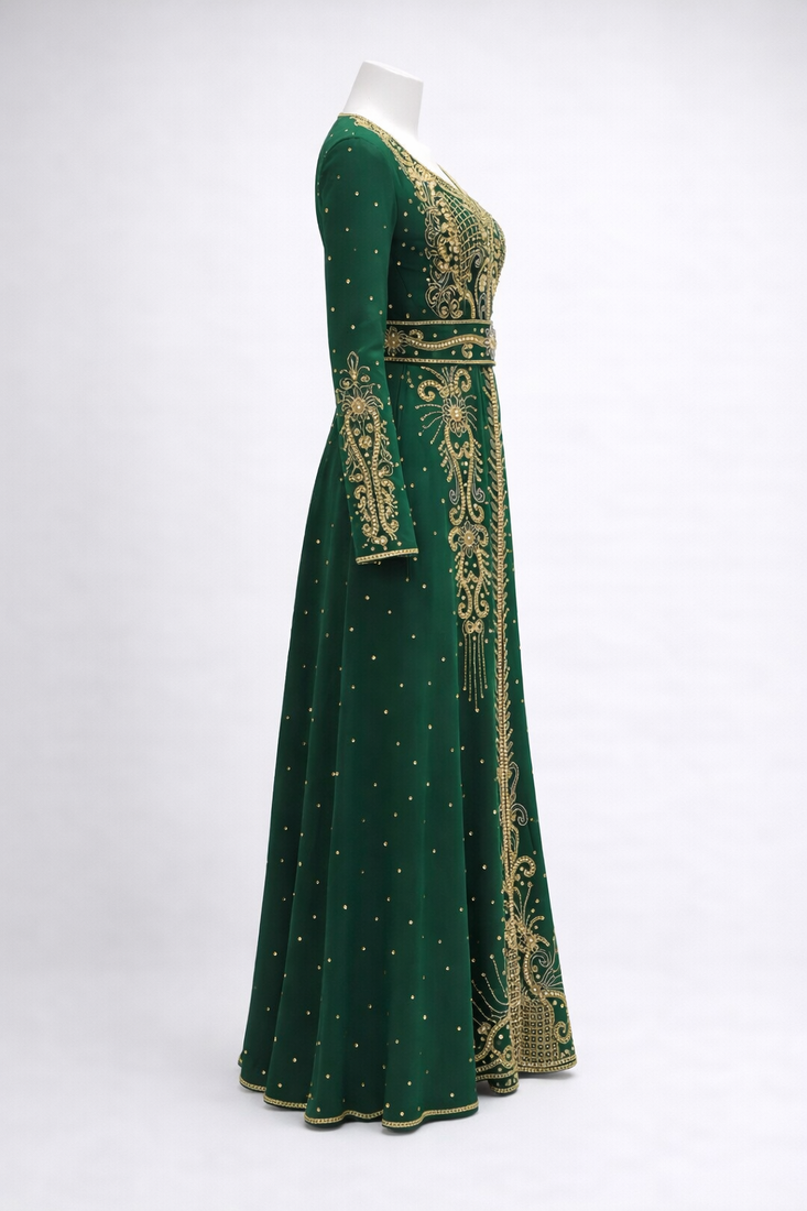 | Product Description | This Breathtaking Sky Blue Kaftan Gown Captures The Essence Of Luxury Event Wear, Ideal For Weddings, Receptions, And Gala Evenings. Made From Soft, Flowing Georgette, It Falls Beautifully To A Full Length Silhouette And Features A Flattering V Neckline That Adds A Touch Of Modern Grace. Every Inch Of The Gown Is Richly Detailed With Intricate Gold And Silver Toned Hand Embroidery, Highlighted By Delicate Sparkling Embellishments Arranged In A Traditional Pattern. The Flowing Split Batwing Style Cape Sleeves Drape Elegantly To The Floor, Creating A Sense Of Movement And Regal Charm. Designed To Turn Heads, This Piece Is Perfect For Making A Lasting Impression At Any Grand Occasion. |