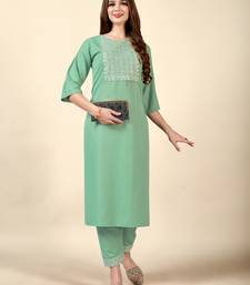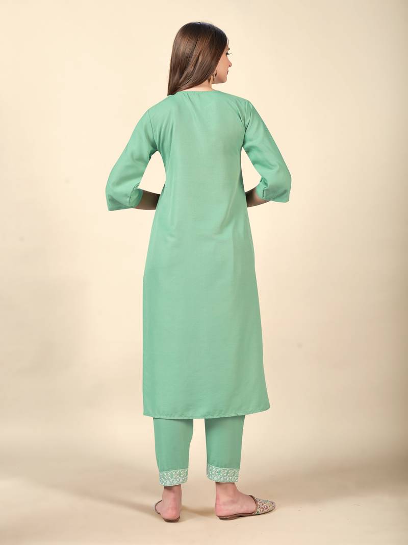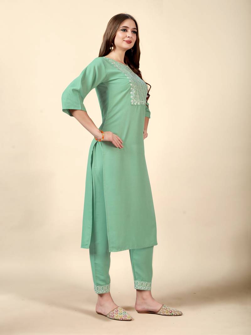 | Product Name | Pista Embroidery Work Cotton Rayon Slub Based Aline Womens Kurti Set | |