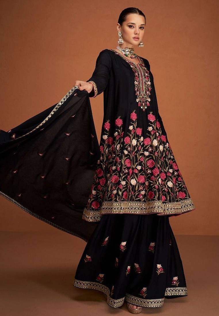Pure chiffon party wear sharara in black color with embroidery work semi stitched