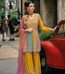 Pure chiffon party wear sharara in yellow color with embroidery work semi stitched