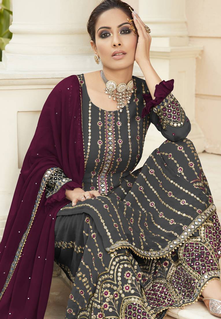 | Product Name | Pure Georgette Party Wear Sharara In Grey Color With Embroidery Work | |