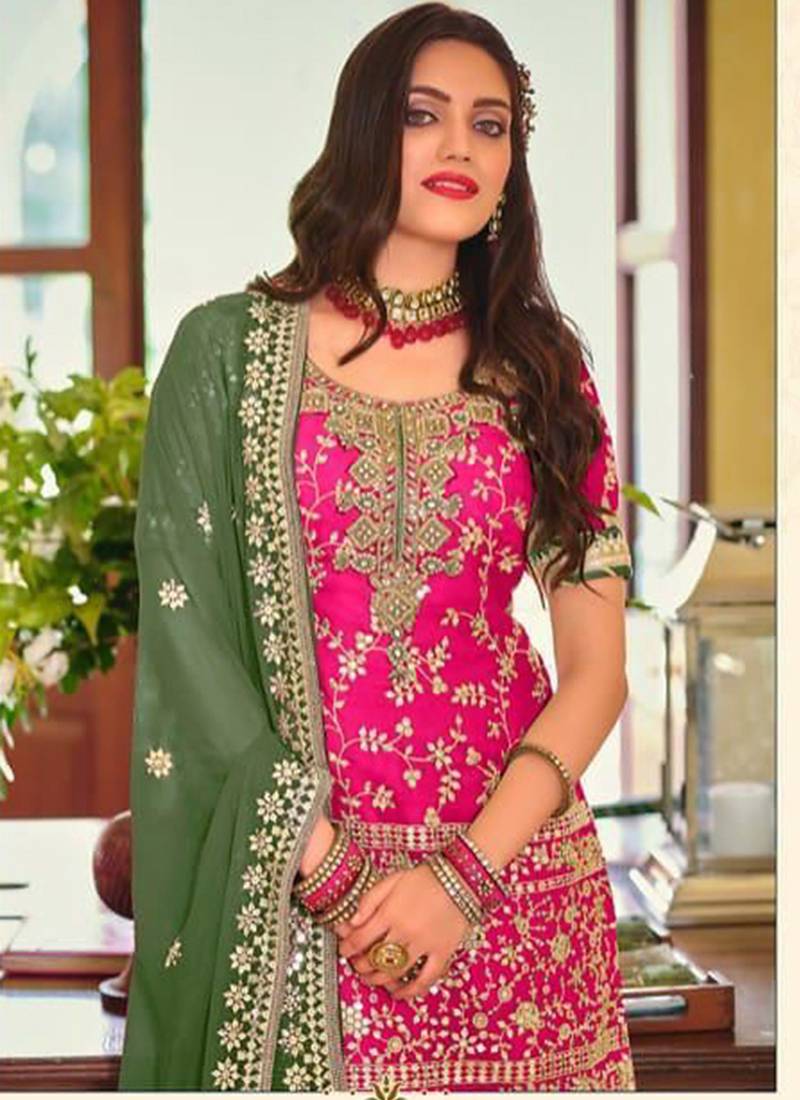 Pink Georgette Sharara Set With Embroidered Work Shown In The Product Images. The Set Includes A Pink Georgette Top With Embroidered Detailing On The Surface, Paired With A Pink Pure Georgette Sharara Bottom In The Same Color. A Green Pure Georgette Dupatta With Consistent Fabric Texture Is Shown With The Outfit. Embroidered Work Is Visible On The Top And Complements The Sheer Georgette Fabric Textures Of All Pieces In The Set.