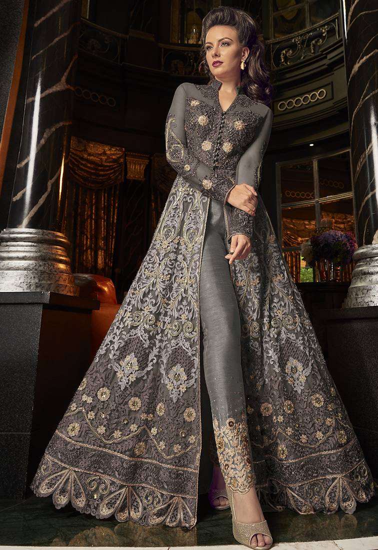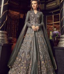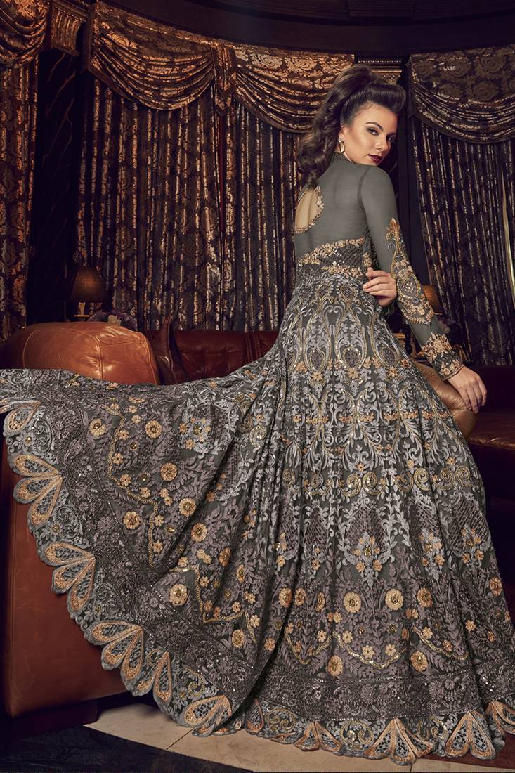 Soft premium net wedding wear gown in grey color with embroidery work semi stitched