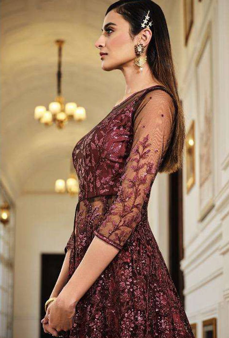Soft premium net wedding wear gown in maroon color with embroidery work semi stitched