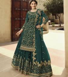 Soft premium net wedding wear sharara in teal green color with embroidery work semi stitched