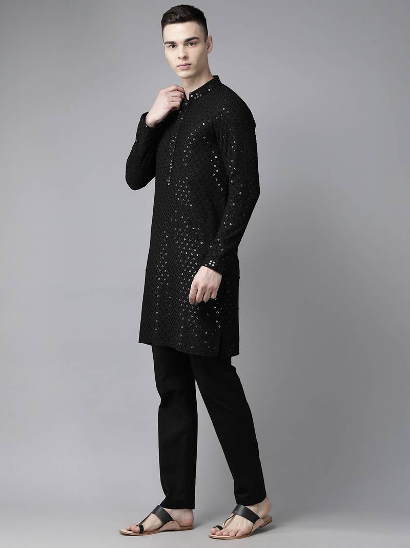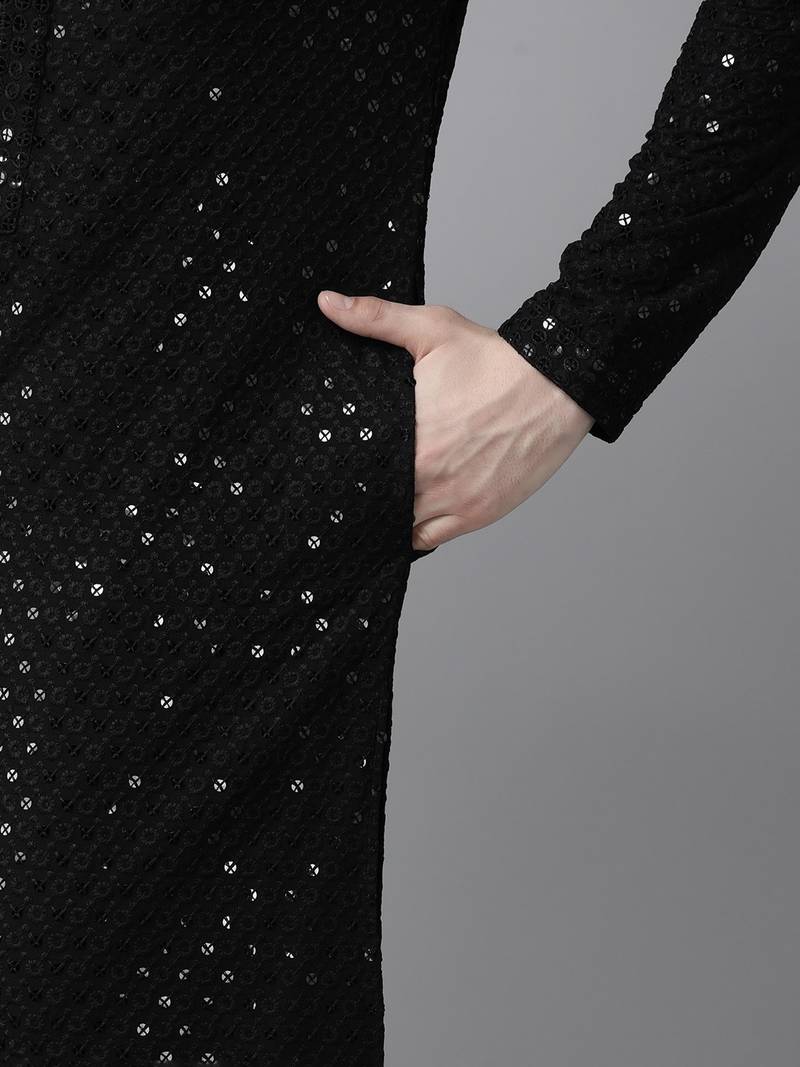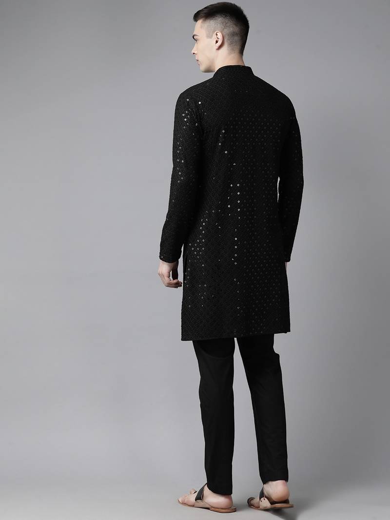 Men black floral embroidered sequined rayon kurta