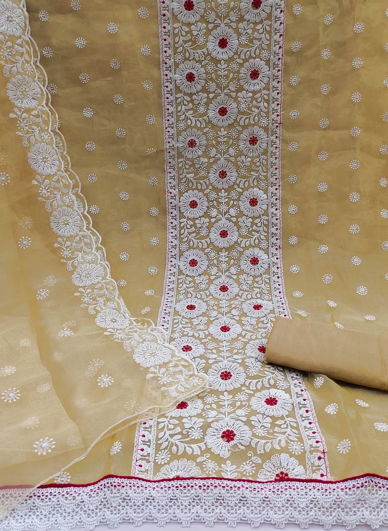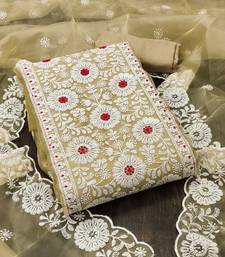 Beige organza embroidered dress material unstitched