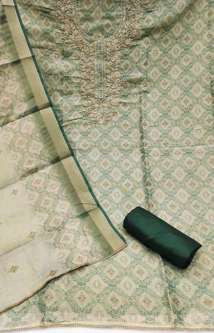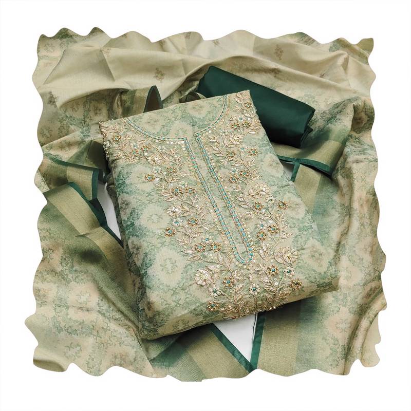 | Product Description | Handcrafted Designer Print, Heavy Handwork And Fancy Border With Stylish Digital Printed Dupatta Straight Style 2.00 Mtr Unstitched Dress Material Top Of Beige Colour Cotton Silk Fabric Also Including 2.40 Mtr Chudidar Style Bottom Piece Material Of Green Colour Dull Santoon Fabric With 2.10 Mtr Dupatta Of Beige Colour Cotton Silk Fabric By Shadow & Saining Brand |