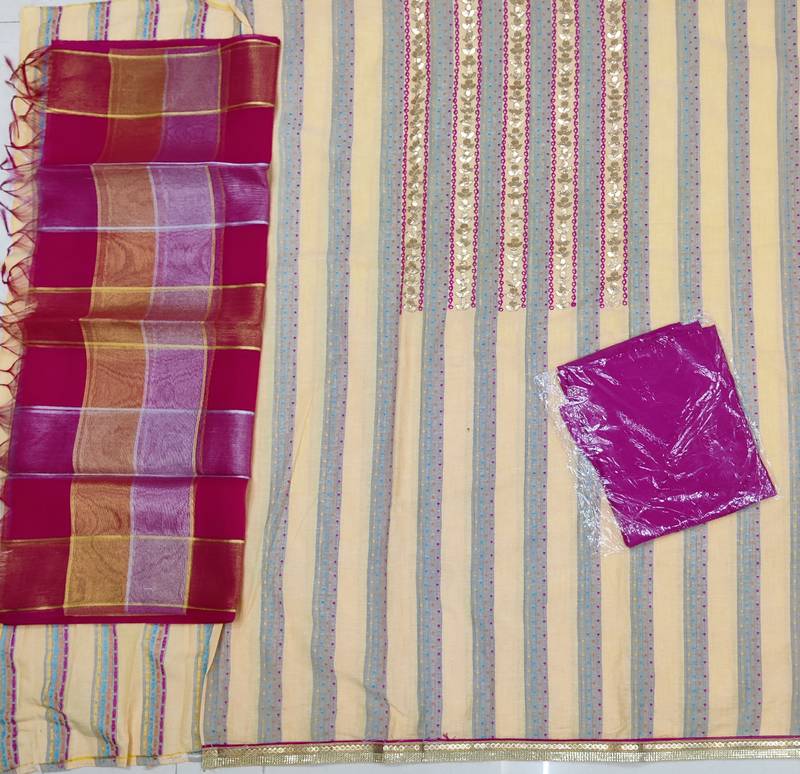Heavy Hand Work With Dupatta Straight Style 2.00 Mtr Unstitched Dress Material Top Of Beige Colour Cotton Fabric Suggestable Quarter Style Sleeves And Round Style Neck Also Including 2.10 Mtr Chudidar Style Bottom Piece Material Of Pink Colour Cotton Fabric With 2.00 Mtr Dupatta Of Multi Colour Banarasi Jacquard Fabric